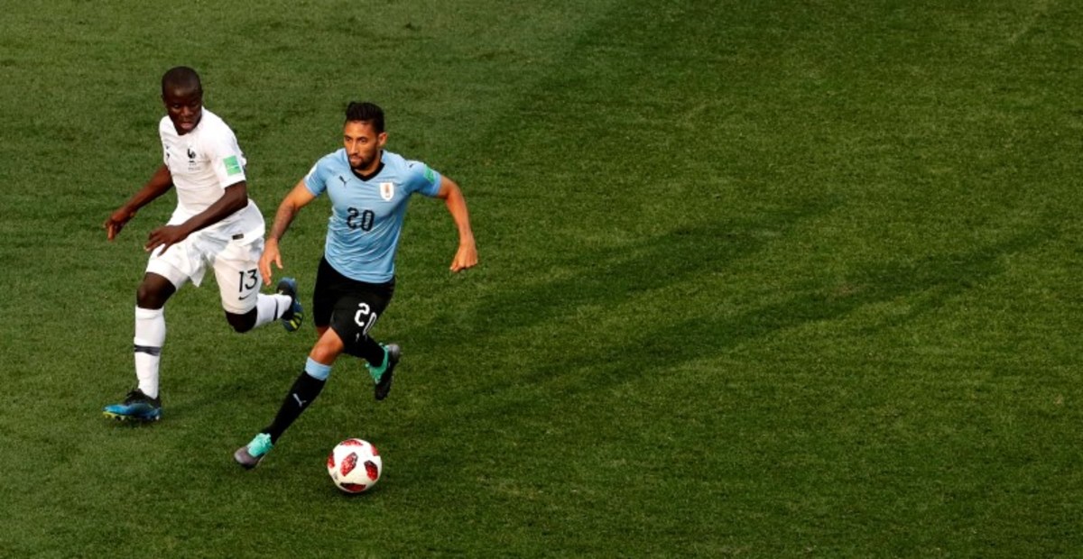 Soccer Football - World Cup - Quarter Final - Uruguay vs France - Nizhny Novgorod Stadium, Nizhny Novgorod, Russia - July 6, 2018 France's N'Golo Kante in action with Uruguay's Jonathan Urretaviscaya REUTERS/Carlos Barria