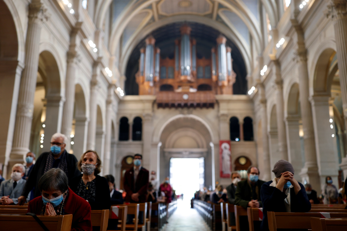 At the Saint-Sulpice church in Paris, a sign at the entrance read "space limited to 30 people", but there were no controls on how many people could enter and about 50 to 60 people, all wearing masks, took part in the service, seated on chairs spaced far apart.