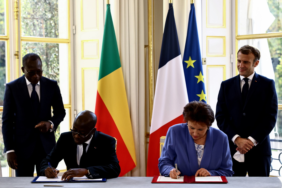 "You'll agree with me that the restitution of 26 artworks we are celebrating today is only a step in the ambitious process of equity and of restitution of ... heritage extorted from the territory of the Benin kingdom by France," Talon said, speaking to French President Emmanuel Macron after a signing ceremony at the Elysee Palace.