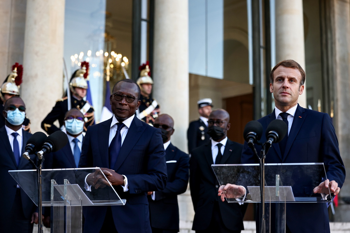 French President Emmanuel Macron and Benin's President Patrice Talon hold a news conference after the signing an agreement about the return of looted cultural artefacts to the African country, at the Elysee Palace in Paris, France, November 9, 2021. REUTERS/Sarah MeyssonnierFrench President Emmanuel Macron welcomes Benin's President Patrice Talon as he arrives to sign an agreement about the return of looted cultural artefacts to the African country, at the Elysee Palace in Paris, France, November 9, 2021. REUTERS/Sarah Meyssonnier