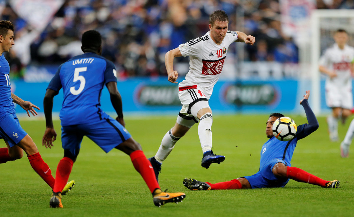 Soccer Football - 2018 World Cup Qualifications - Europe - France vs Belarus - Stade de France, Paris, France - October 10, 2017 France's Blaise Matuidi in action with Belarus’ Maksim Skavysh REUTERS/Pascal Rossignol