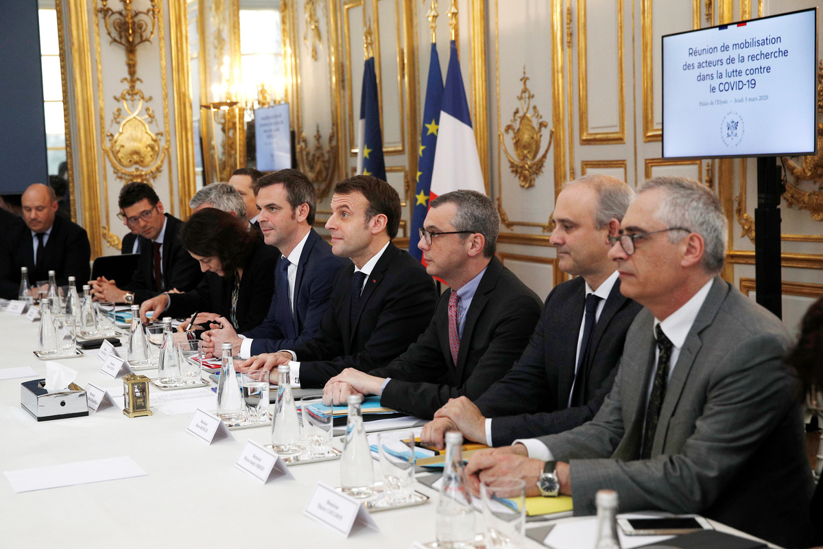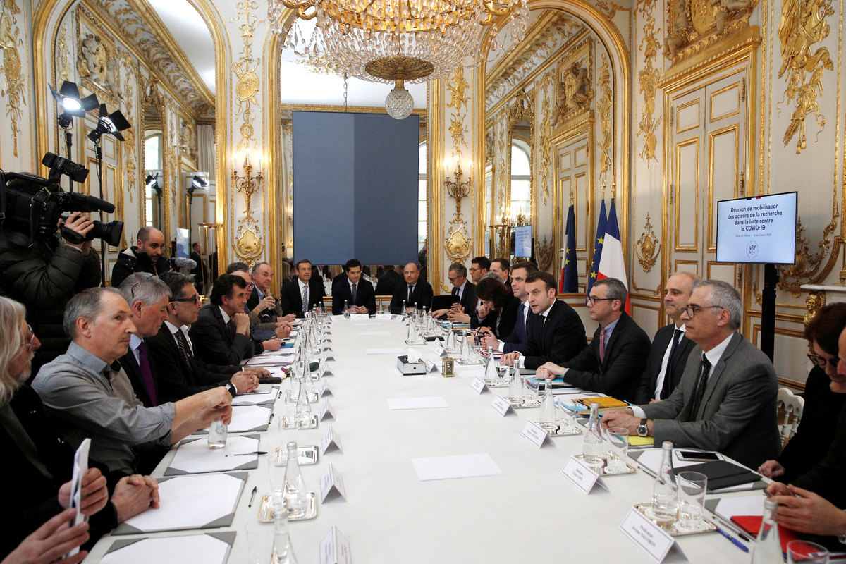 French President Emmanuel Macron meets with researchers ans scientists concerned by the coronavirus COVID-19 outbreak, at the Elysee Palace in Paris, France, March 5, 2020. Yoan Valat/Pool via REUTERS
