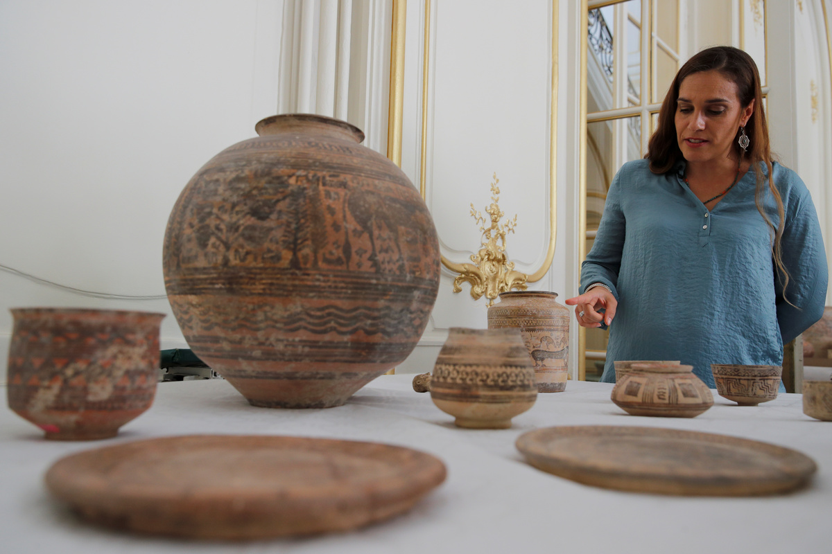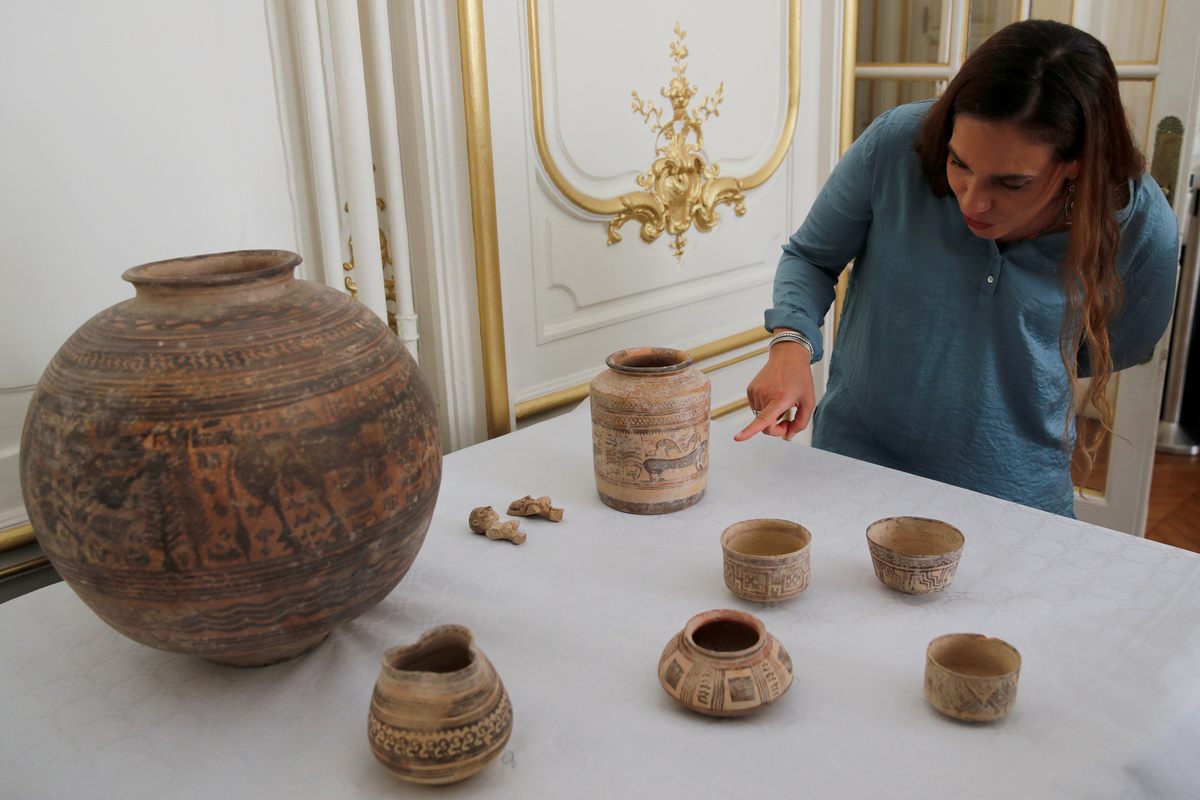 Archaeologist Aurore Didier points to some artifacts amongst the 445 artifacts from the 2nd and 3rd millennium BC which were seized by French customs between 2006 and 2007, before being returned by French authorities to Pakistan, during a ceremony at the Embassy of Pakistan in Paris, France, July 2, 2019. REUTERS/Philippe Wojazer