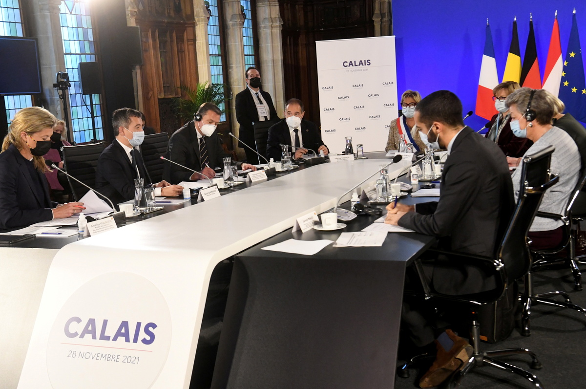French Interior Minister Gerald Darmanin speaks during a meeting with Ministers in response to cross-Channel migration, in Calais, France, November 28, 2021. Francois Lo Presti/ Pool via REUTERS