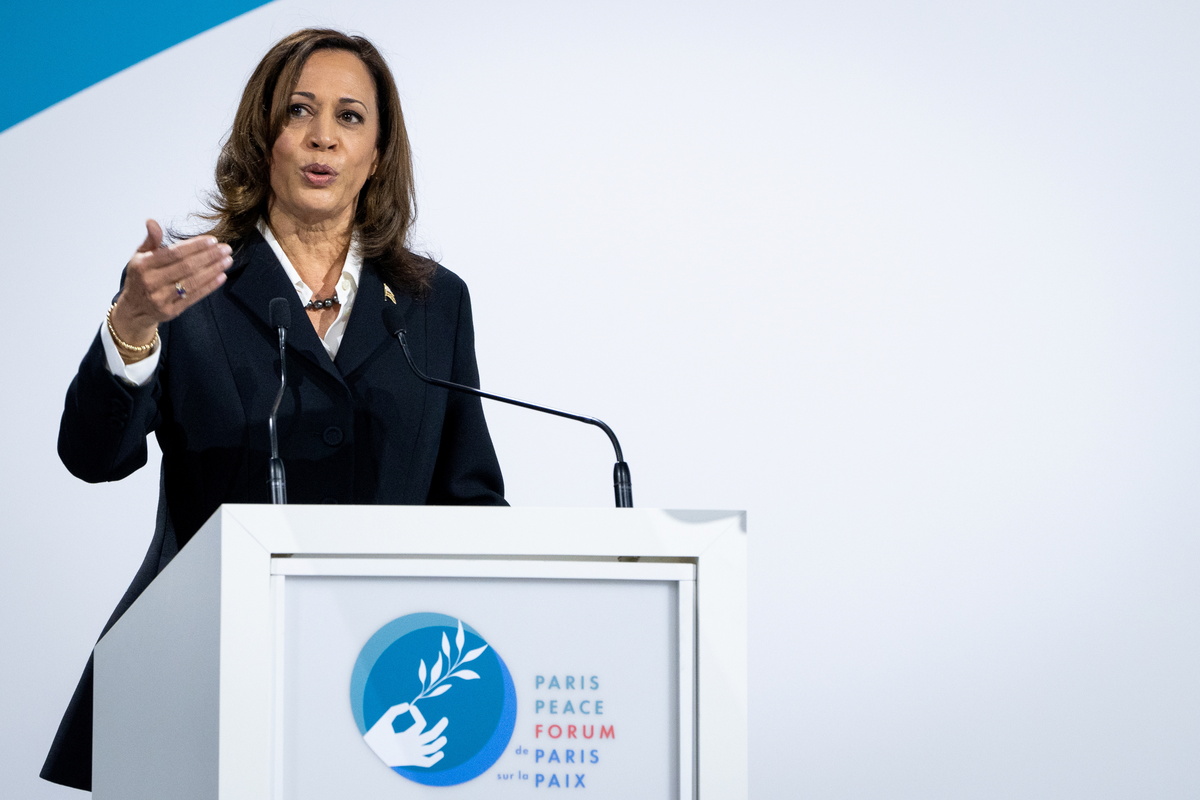 U.S. Vice President Kamala Harris delivers opening remarks at the Paris Peace Forum in Paris, France, November 11, 2021. Sarahbeth Maney/Pool via REUTERS