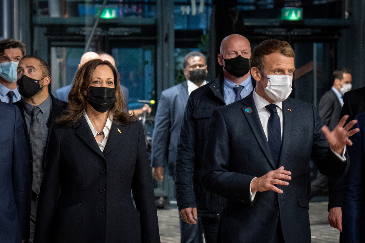 U.S. Vice President Kamala Harris and French President Emmanuel Macron arrive at a Paris Peace Forum in Paris, France November 11, 2021. Sarahbeth Maney/Pool via REUTERS