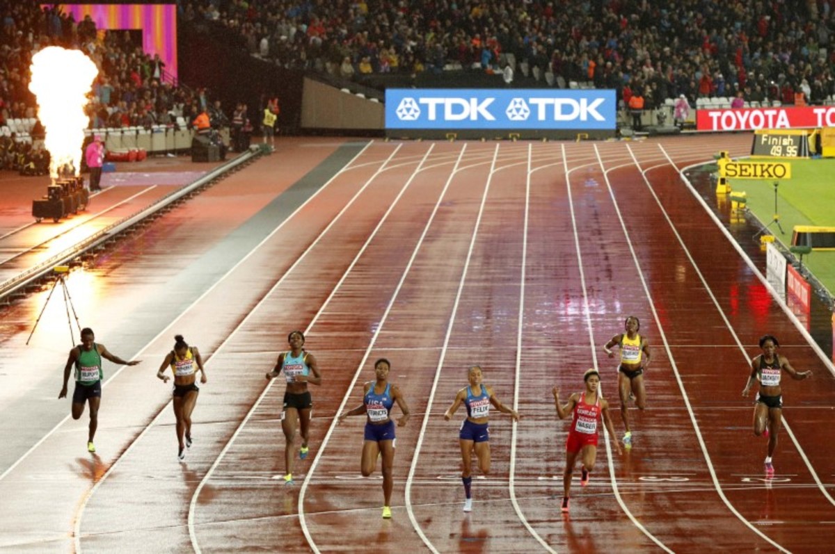 It was incredible finish to a race that had appeared to be going to form for the first 300 metres. Felix looked her usual smooth self despite the sodden track and had made up the stagger on Francis, a lane outside her, by the end of the first bend.