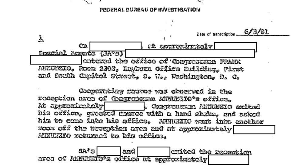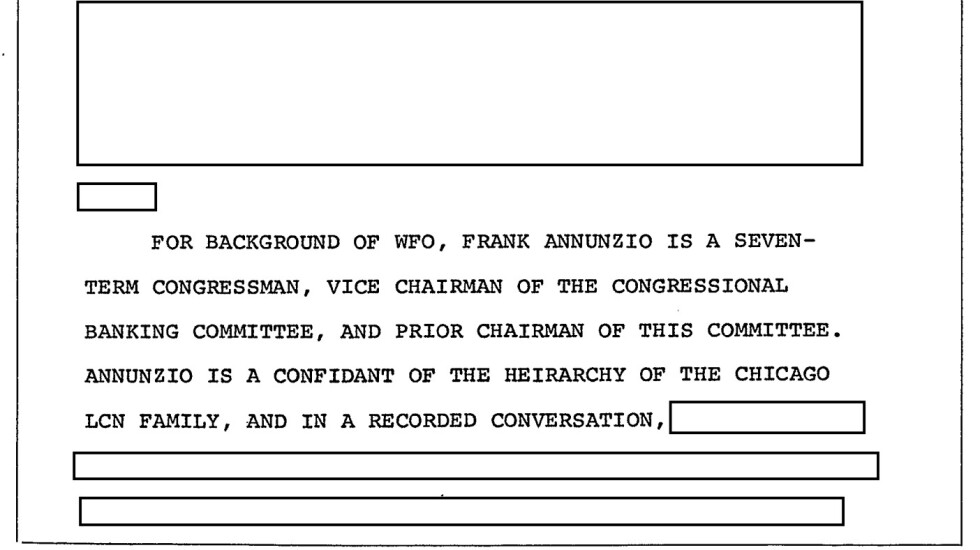 As part of the investigation, the records show, FBI agents did surveillance on Annunzio — who retired from Congress in the early 1990s after representing parts of Chicago for nearly 30 years, from 1965 to 1993 — at his congressional offices in Washington, D.C.
