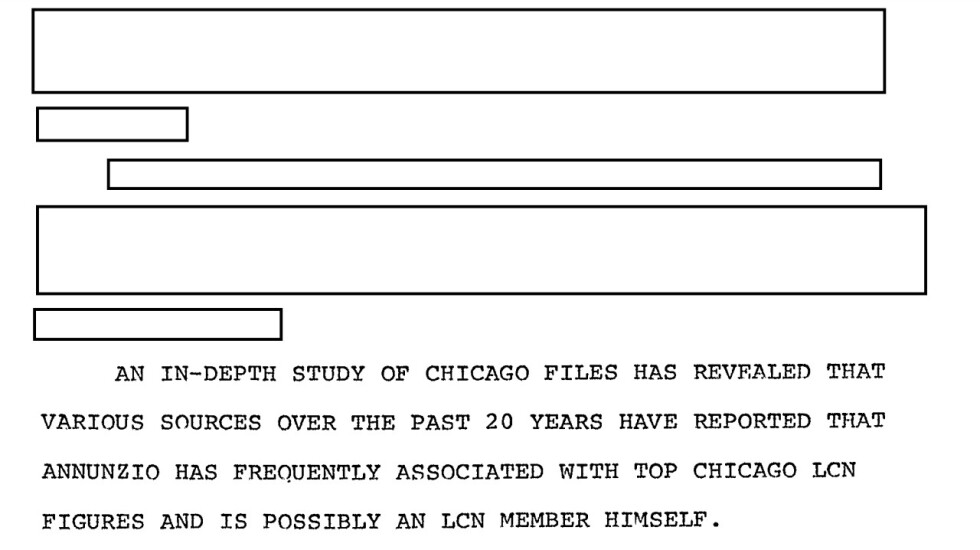 Another FBI record says, “An in-depth study of Chicago files has revealed that various sources over the past 20 years have reported that Annunzio has frequently associated with top Chicago LCN figures and is possibly an LCN member himself.”