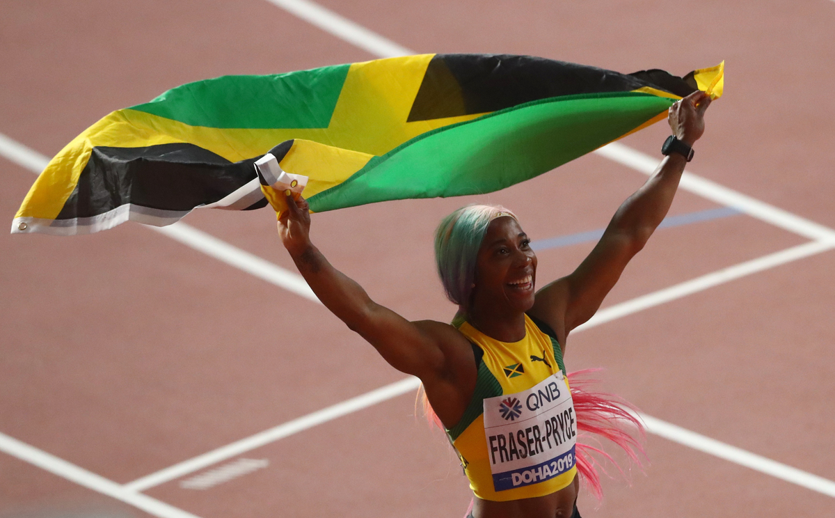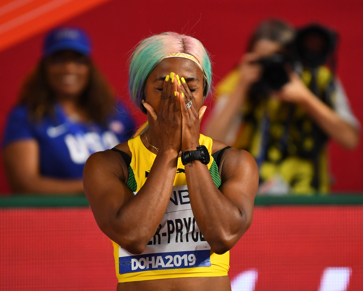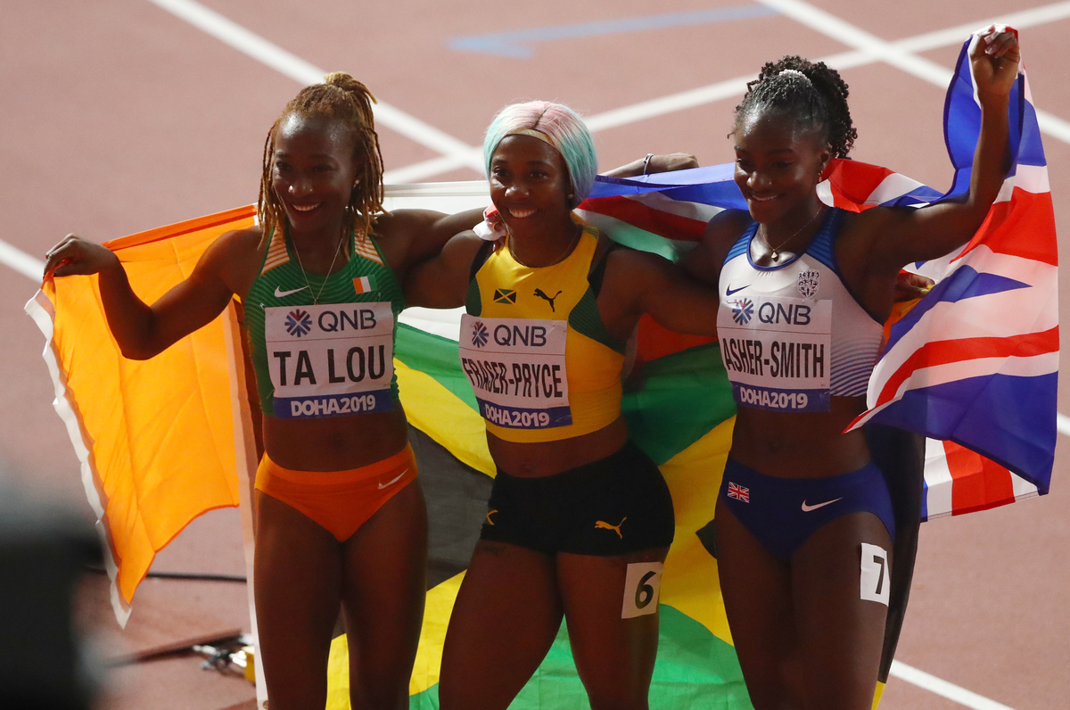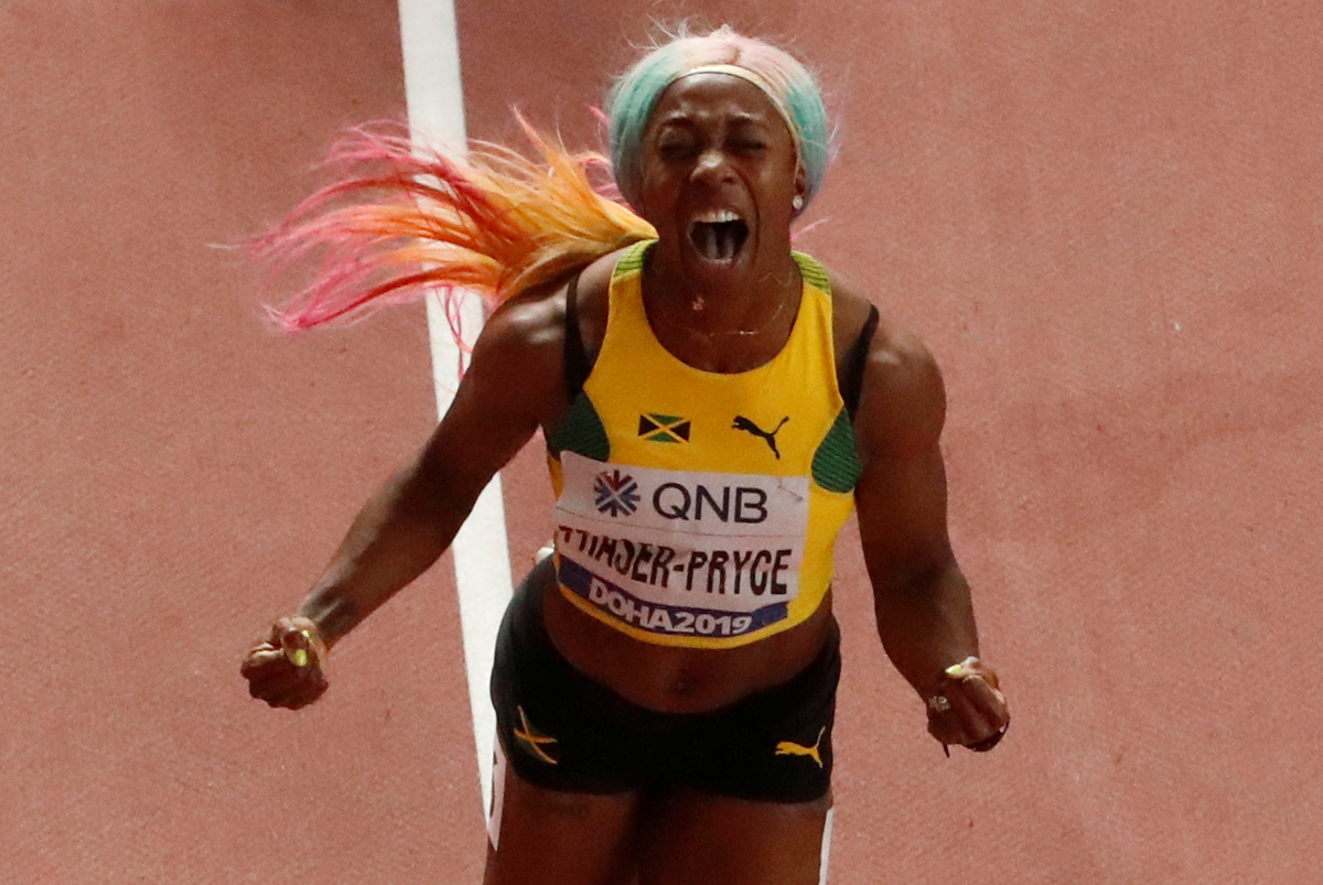 Athletics - World Athletics Championships - Doha 2019 - Women's 100 Metres Final - Khalifa International Stadium, Doha, Qatar - September 29, 2019 Jamaica's Shelly-Ann Fraser-Pryce celebrates winning gold REUTERS/Fabrizio Bensch Athletics - World Athletics Championships - Doha 2019 - Women's 100 Metres Final - Khalifa International Stadium, Doha, Qatar - September 29, 2019. Jamaica's Shelly-Ann Fraser-Pryce and Ivory Coast's Marie-Josee Ta Lou and Britain's Dina Asher-Smith celebrate. REUTERS/Ahmed JadallahAthletics - World Athletics Championships - Doha 2019 - Women's 100 Metres Final - Khalifa International Stadium, Doha, Qatar - September 29, 2019 Jamaica's Shelly-Ann Fraser-Pryce celebrates winning gold REUTERS/Lucy NicholsonAthletics - World Athletics Championships - Doha 2019 - Women's 100 Metres Finals - Khalifa International Stadium, Doha, Qatar - September 29, 2019 Jamaica's Shelly-Ann Fraser-Pryce finishes to win gold REUTERS/Ahmed JadallahAthletics - World Athletics Championships - Doha 2019 - Women's 100 Metres Final - Khalifa International Stadium, Doha, Qatar - September 29, 2019. Jamaica's Shelly-Ann Fraser-Pryce celebrates winning gold. REUTERS/Ahmed JadallahAthletics - World Athletics Championships - Doha 2019 - Women's 100 Metres Final - Khalifa International Stadium, Doha, Qatar - September 29, 2019 Jamaica's Shelly-Ann Fraser-Pryce celebrates winning gold REUTERS/Hannah MckayAthletics - World Athletics Championships - Doha 2019 - Women's 100 Metres Final - Khalifa International Stadium, Doha, Qatar - September 29, 2019 Jamaica's Shelly-Ann Fraser-Pryce holds a child as she celebrates winning gold REUTERS/Dylan MartinezAthletics - World Athletics Championships - Doha 2019 - Women's 100 Metres Final - Khalifa International Stadium, Doha, Qatar - September 29, 2019 Jamaica's Shelly-Ann Fraser-Pryce races to the line to win gold ahead of Britain's Dina Asher-Smith who wins silver and Ivory Coast's Marie-Josee Ta Lou who wins bronze REUTERS/Fabrizio BenschAthletics - World Athletics Championships - Doha 2019 - Women's 100 Metres Final - Khalifa International Stadium, Doha, Qatar - September 29, 2019 Jamaica's Shelly-Ann Fraser-Pryce in action with Jamaica's Elaine Thompson and Ivory Coast's Marie-Josee Ta Lou REUTERS/Ibraheem Al Omari
