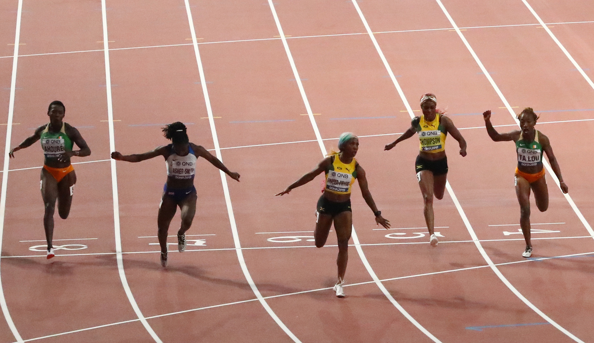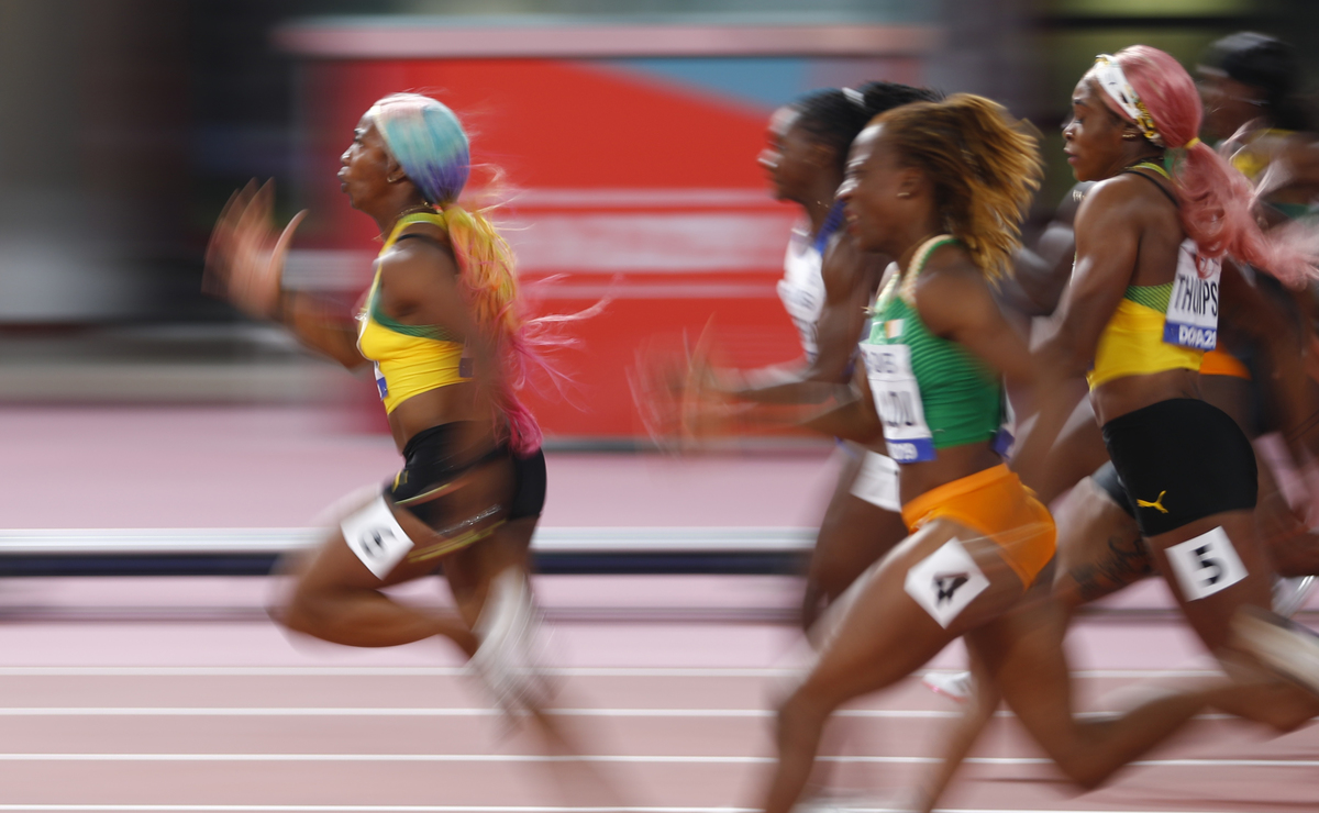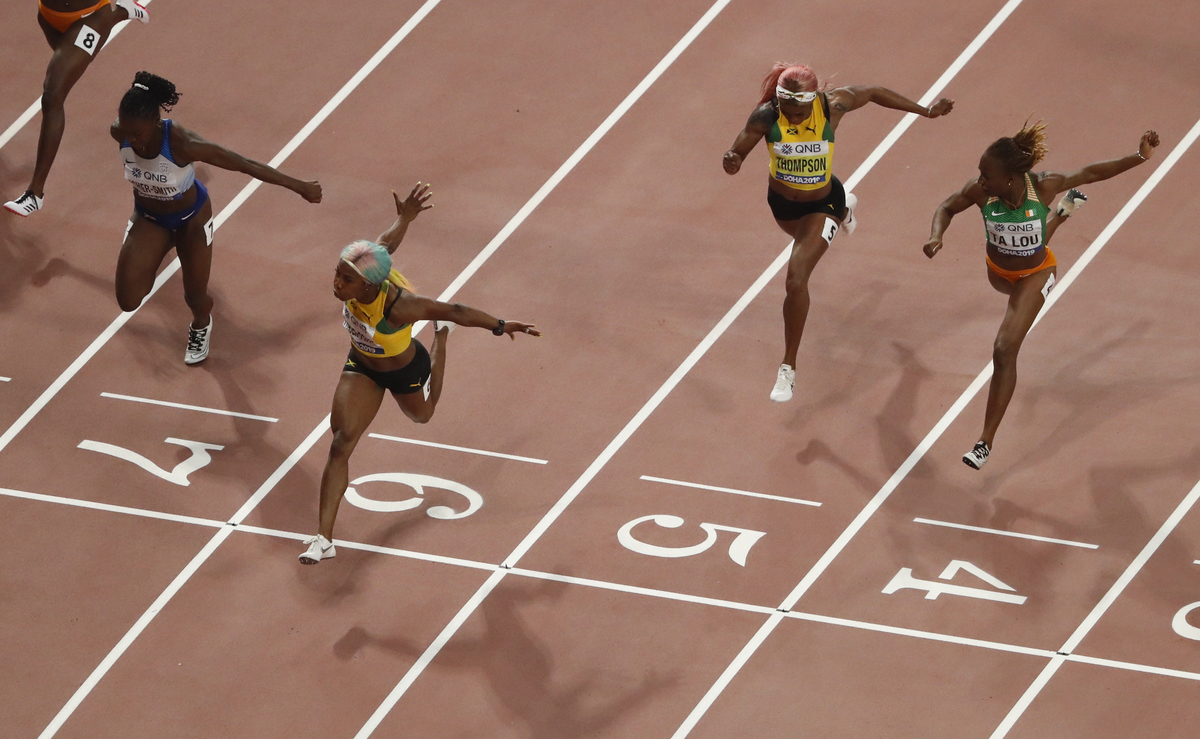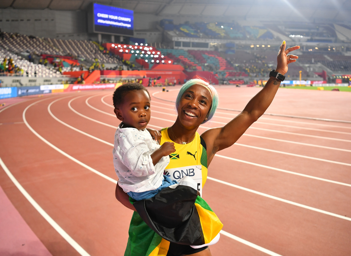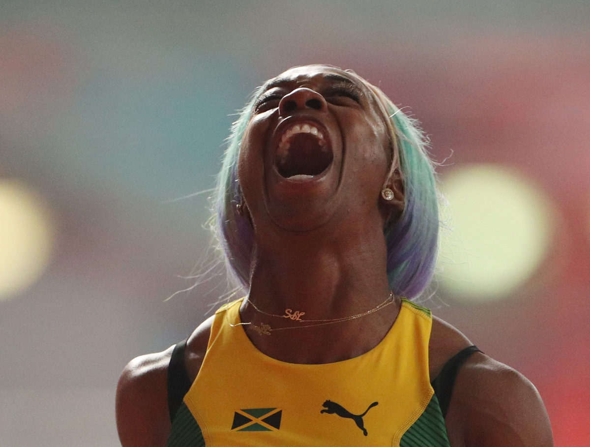 Athletics - World Athletics Championships - Doha 2019 - Women's 100 Metres Final - Khalifa International Stadium, Doha, Qatar - September 29, 2019 Jamaica's Shelly-Ann Fraser-Pryce celebrates winning gold REUTERS/Fabrizio Bensch Athletics - World Athletics Championships - Doha 2019 - Women's 100 Metres Final - Khalifa International Stadium, Doha, Qatar - September 29, 2019. Jamaica's Shelly-Ann Fraser-Pryce and Ivory Coast's Marie-Josee Ta Lou and Britain's Dina Asher-Smith celebrate. REUTERS/Ahmed JadallahAthletics - World Athletics Championships - Doha 2019 - Women's 100 Metres Final - Khalifa International Stadium, Doha, Qatar - September 29, 2019 Jamaica's Shelly-Ann Fraser-Pryce celebrates winning gold REUTERS/Lucy NicholsonAthletics - World Athletics Championships - Doha 2019 - Women's 100 Metres Finals - Khalifa International Stadium, Doha, Qatar - September 29, 2019 Jamaica's Shelly-Ann Fraser-Pryce finishes to win gold REUTERS/Ahmed JadallahAthletics - World Athletics Championships - Doha 2019 - Women's 100 Metres Final - Khalifa International Stadium, Doha, Qatar - September 29, 2019. Jamaica's Shelly-Ann Fraser-Pryce celebrates winning gold. REUTERS/Ahmed JadallahAthletics - World Athletics Championships - Doha 2019 - Women's 100 Metres Final - Khalifa International Stadium, Doha, Qatar - September 29, 2019 Jamaica's Shelly-Ann Fraser-Pryce celebrates winning gold REUTERS/Hannah MckayAthletics - World Athletics Championships - Doha 2019 - Women's 100 Metres Final - Khalifa International Stadium, Doha, Qatar - September 29, 2019 Jamaica's Shelly-Ann Fraser-Pryce holds a child as she celebrates winning gold REUTERS/Dylan MartinezAthletics - World Athletics Championships - Doha 2019 - Women's 100 Metres Final - Khalifa International Stadium, Doha, Qatar - September 29, 2019 Jamaica's Shelly-Ann Fraser-Pryce races to the line to win gold ahead of Britain's Dina Asher-Smith who wins silver and Ivory Coast's Marie-Josee Ta Lou who wins bronze REUTERS/Fabrizio BenschAthletics - World Athletics Championships - Doha 2019 - Women's 100 Metres Final - Khalifa International Stadium, Doha, Qatar - September 29, 2019 Jamaica's Shelly-Ann Fraser-Pryce in action with Jamaica's Elaine Thompson and Ivory Coast's Marie-Josee Ta Lou REUTERS/Ibraheem Al Omari