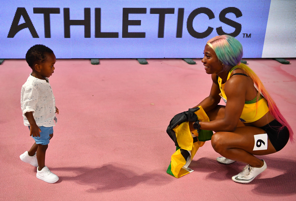 Letting out a mighty scream as she crossed the line Fraser-Pryce wrapped herself in the Jamaican flag then found her son Zyon, who was soon asleep on her shoulder, as she took a victory lap around the vacant stadium.