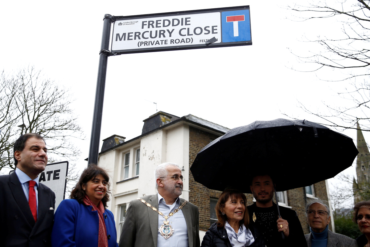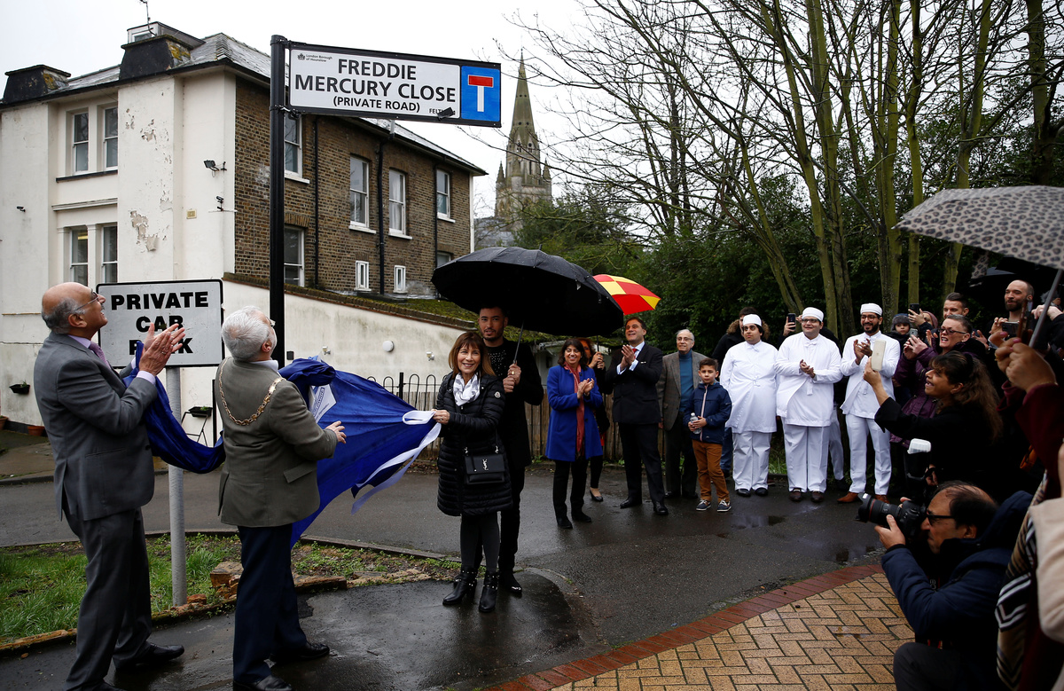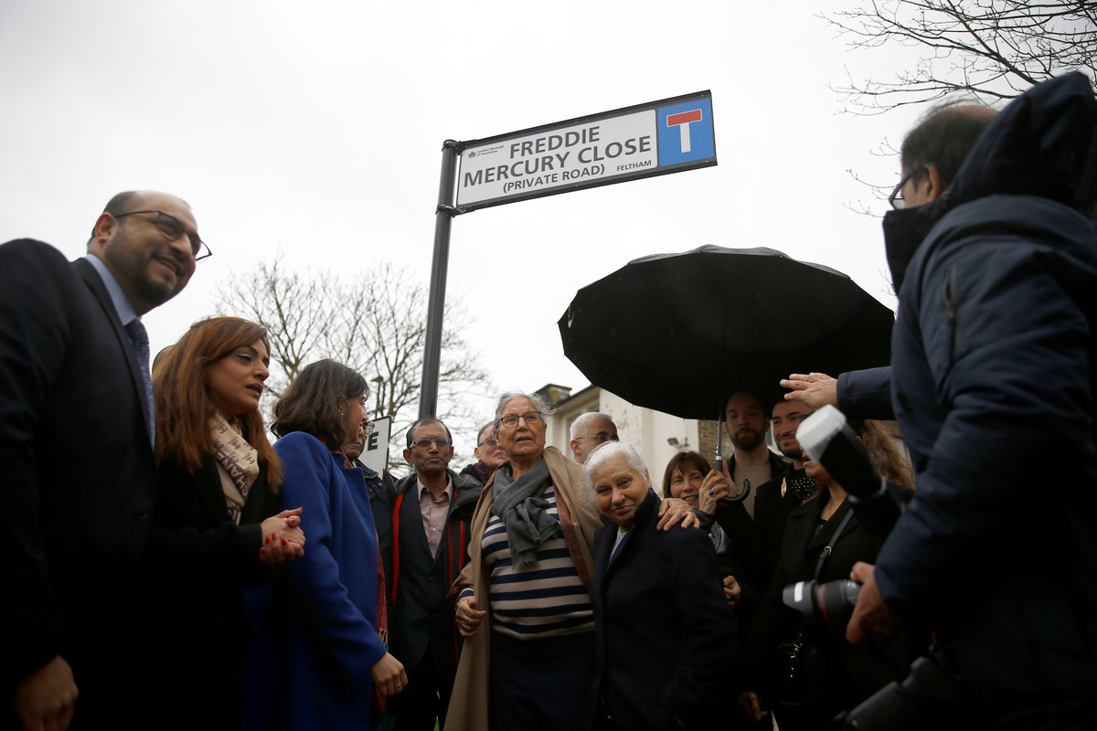 Kashmira Bulsara, sister of the late singer Freddie Mercury and Mayor of Hounslow Tony Louki gather under the unveiled sign during a ceremony to rename a street in Feltham "Freddie Mercury Close", in Greater London, Britain February 24, 2020. REUTERS/Henry NichollsKashmira Bulsara, sister of the late singer Freddie Mercury, reacts during the ceremony to rename a street in Feltham "Freddie Mercury Close", in Greater London, Britain February 24, 2020. REUTERS/Henry NichollsThe unveiled sign to rename a street in Feltham "Freddie Mercury Close" is seen in Greater London, Britain, February 24, 2020. REUTERS/Henry NichollsKashmira Bulsara, sister of the late singer Freddie Mercury, and Mayor of Hounslow Tony Louki unveil a new sign during a ceremony to rename a street in Feltham "Freddie Mercury Close", in Greater London, Britain February 24, 2020. REUTERS/Henry NichollsKashmira Bulsara, sister of the late singer Freddie Mercury and Mayor of Hounslow Tony Louki (back) gather under the unveiled sign during a ceremony to rename a street in Feltham "Freddie Mercury Close", in Greater London, Britain February 24, 2020. REUTERS/Henry Nicholls