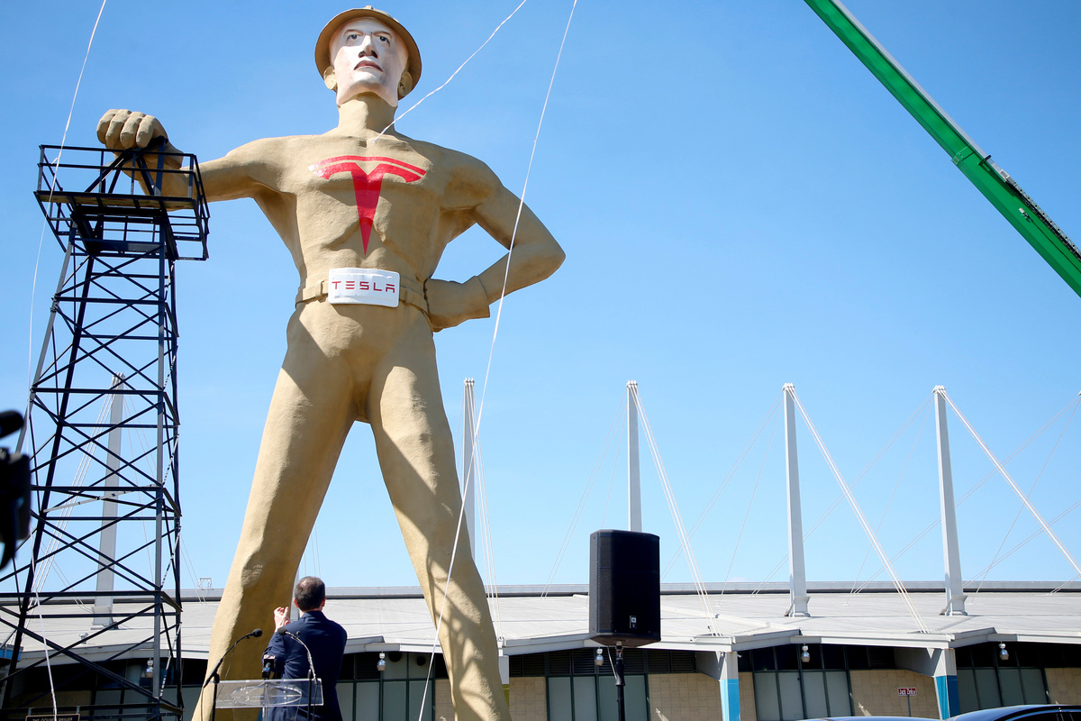 That Golden Driller statue? It was recently repainted by a local Tesla fan club to look something like Musk, sporting a Tesla logo on its chest and a belt buckle emblazoned with the company's name.