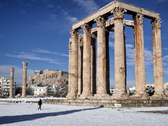 Snow dusted the ancient Acropolis in Athens and closed most schools in the capital, while more than 10 heated shelters were opened for homeless people.