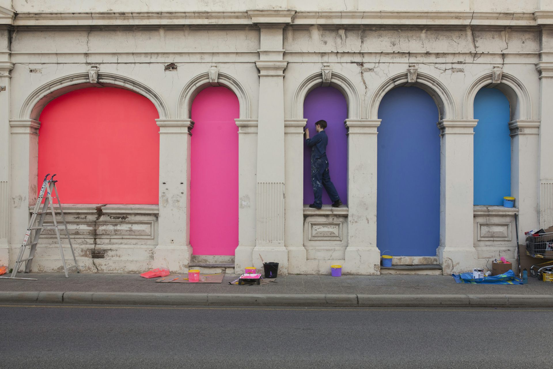 Zora Kreuzer’s Arcade is deceptively simple. Appropriating the façade of the old Liebler Building she has chosen a palette of fluoro hues to paint to create a rainbow spectrum of spaces in the former arched window cavities. Not only do they re-energise the building but instantly she has created a photo booth for the thousands of visitors streaming through the historic site.
