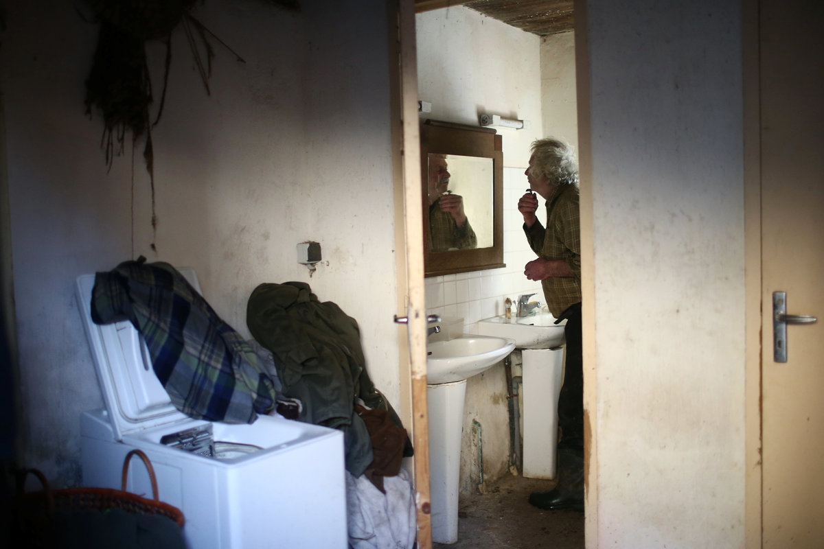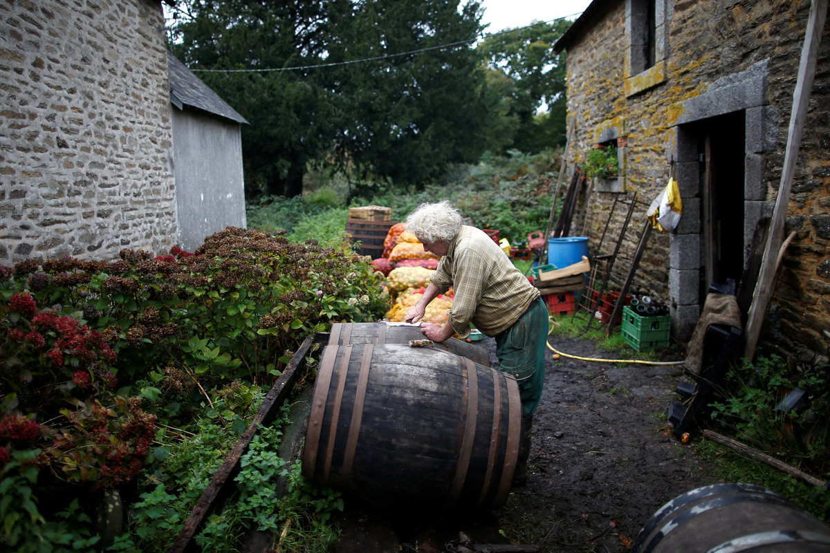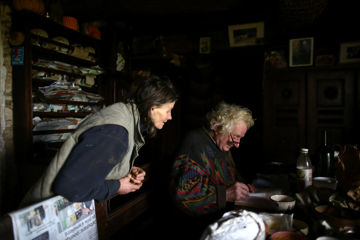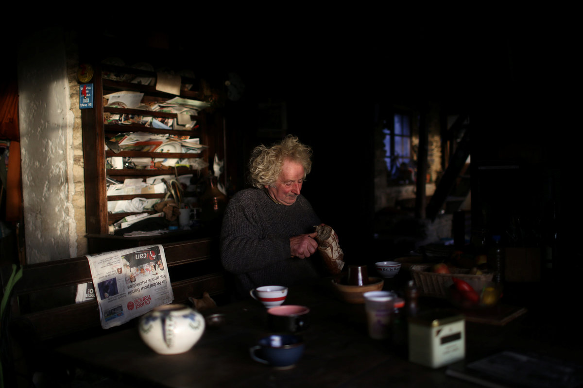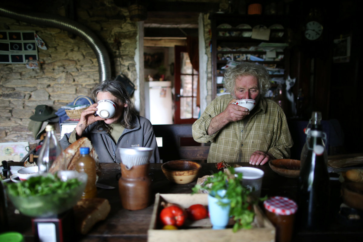 French farmer Jean-Bernard Huon, 70, looks on as he works on his land near his farm in Riec-sur-Belon, France, October 25, 2017. REUTERS/Stephane MaheFrench farmer Jean-Bernard Huon, 70, inspects a barrel used for cider at his farm in Riec-sur-Belon, France, October 24, 2017. REUTERS/Stephane MaheItems are dispayed on a windowsill at the farm of French farmer Jean-Bernard Huon in Riec-sur-Belon, France, October 5, 2017. REUTERS/Stephane MaheFrench farmer Jean-Bernard Huon, 70, and his friend Jeremy harvest beets on land near his farm in Riec-sur-Belon, France, October 24, 2017. REUTERS/Stephane Mahe French farmer Jean-Bernard Huon, 70, and his companion Laurence have lunch at their farm in Riec-sur-Belon, France, October 5, 2017. REUTERS/Stephane MaheFrench farmer Jean-Bernard Huon, 70, holds an old family photograph at his farm in Riec-sur-Belon, France, October 5, 2017. REUTERS/Stephane MaheFrench farmer Jean-Bernard Huon, 70, toasts with bikers during the annual biker rally at his farm in Riec-sur-Belon, France, January 27, 2018. REUTERS/Stephane MaheA dark sky hangs over a field near the farm of French farmer Jean-Bernard Huon in Riec-sur-Belon, France, December 14, 2017. REUTERS/Stephane Mahe An old yoke hangs on a wall in the farm of French farmer Jean-Bernard Huon in Riec-sur-Belon, France, October 25, 2017. REUTERS/Stephane MaheFrench farmer Jean-Bernard Huon, 70, writes notes beside his companion Laurence, at their farm in Riec-sur-Belon, France, February 1, 2018. REUTERS/Stephane MaheFrench farmer Jean-Bernard Huon, 70, shaves in the bathroom of his farm in Riec-sur-Belon, France, February 1, 2018. REUTERS/Stephane MaheThe hat of french farmer Jean-Bernard Huon is seen at his farm in Riec-sur-Belon, France, February 1, 2018. REUTERS/Stephane MaheFrench farmer Jean-Bernard Huon, 70, and his companion Laurence harvest beets on their land near their farm in Riec-sur-Belon, France, October 24, 2017. REUTERS/Stephane MaheLaurence, companion of French farmer Jean-Bernard Huon, works on land near their farm in Riec-sur-Belon, France, October 25, 2017. REUTERS/Stephane Mahe