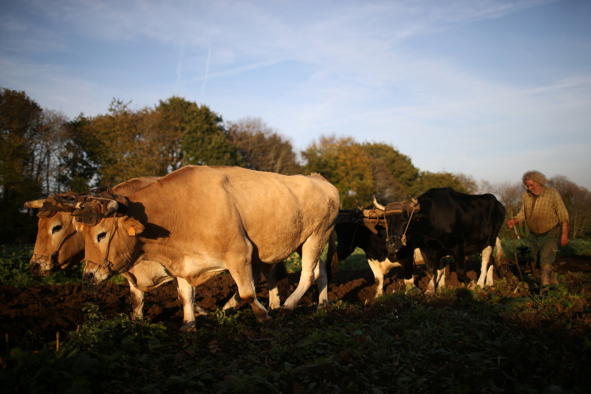 French farmer Jean-Bernard Huon, 70, ploughs his land with oxen near his farm in Riec-sur-Belon, France, October 25, 2017. REUTERS/Stephane Mahe
