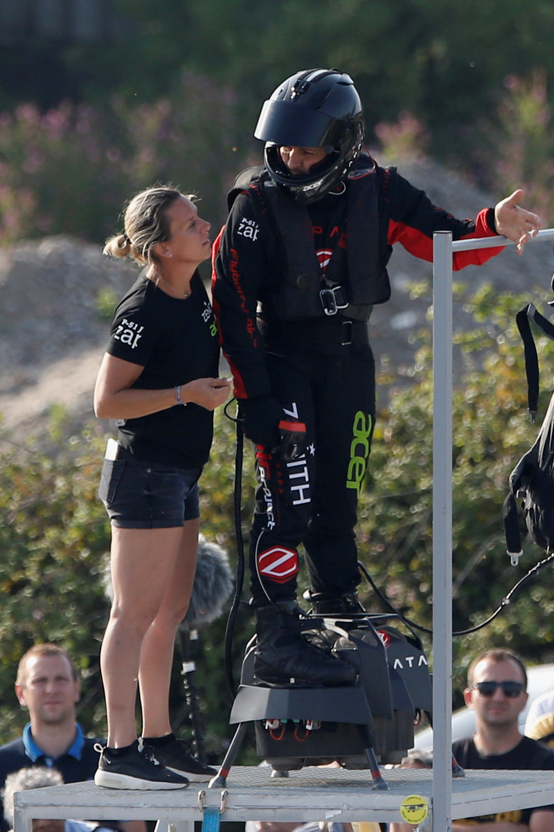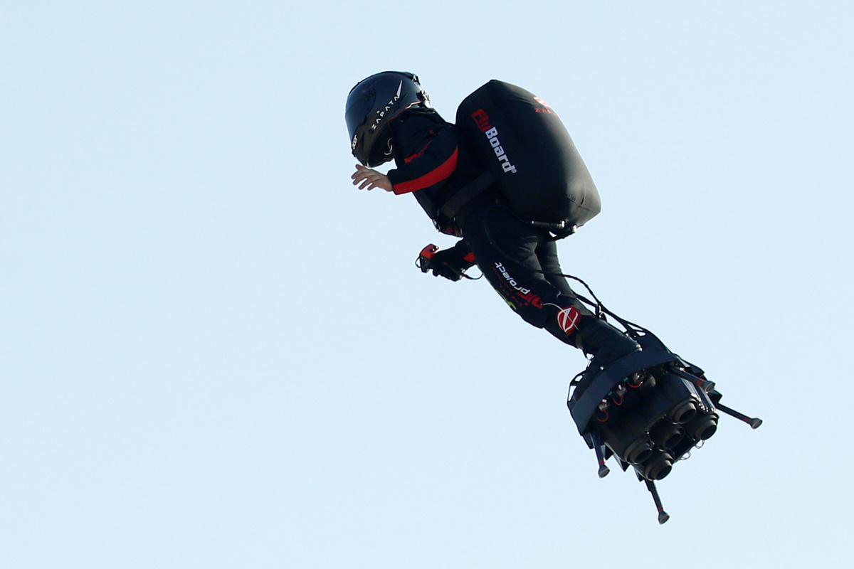 A champion on jetski-powered waterboards, Zapata steers his Flyboard Air craft which flies at up to 140 km per hour by leaning forward or backward, and controls thrust with a throttle connected to his 1,500 horsepower board.