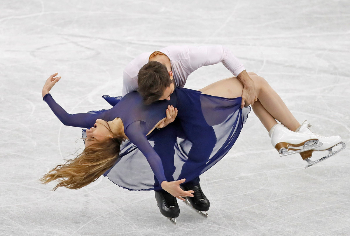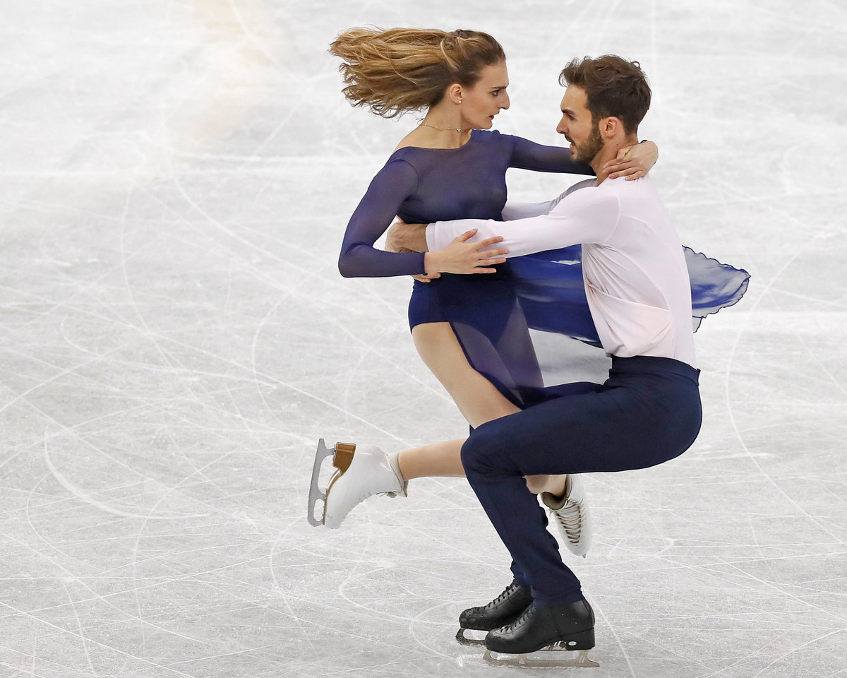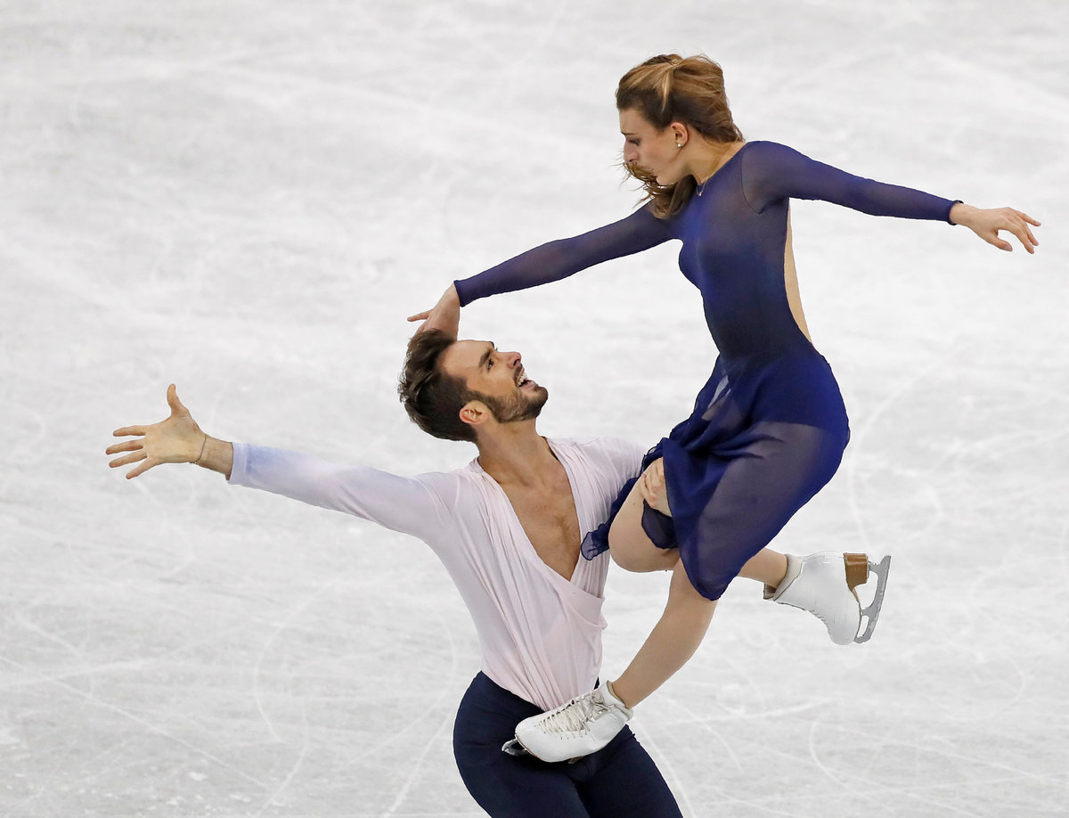 In ice dancing, the French team edged ahead of Virtue and Moir with an elegant, passionate routine to "Moonlight Sonata," winning with 202.16 to 199.86 for the Canadians.