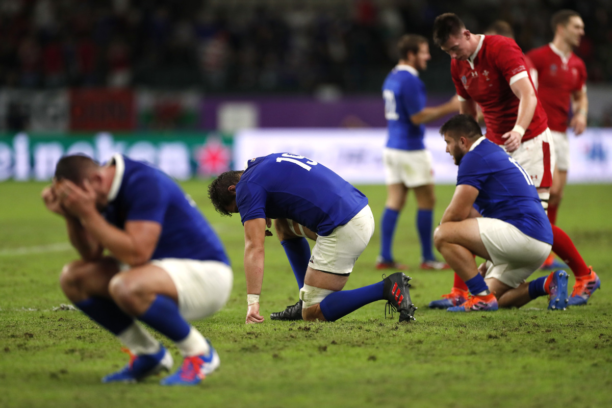 Rugby Union - Rugby World Cup 2019 - Quarter Final - Wales v France - Oita Stadium, Oita, Japan - October 20, 2019 France players look dejected after the match after the match REUTERS/Peter Cziborra