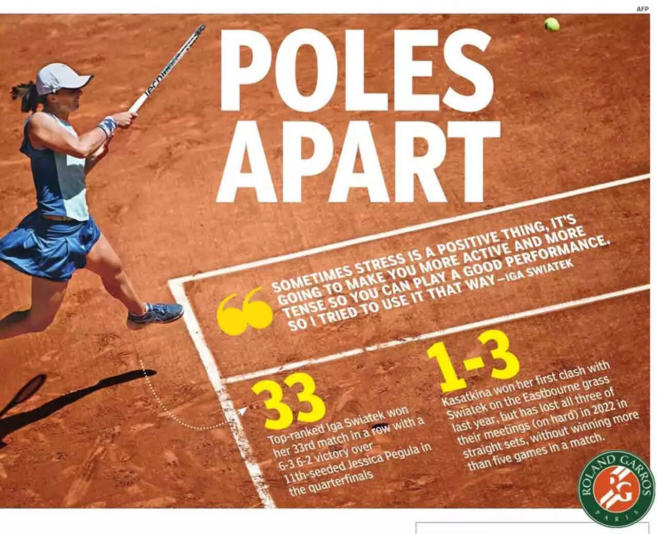 Kasatkina, the 20th seed, held off Veronika Kudermetova's challenge for a 6-4, 7-6 (5) result that gave her first Grand Slam semifinal, coming in her 26th start in a major. Swiatek, in her second Roland Garros semifinal, blew out 21 candles on her birthday cake on Tuesday, and then went on to stop American Jessica Pegula 6-3, 6-2 in a performance that spelt focus.