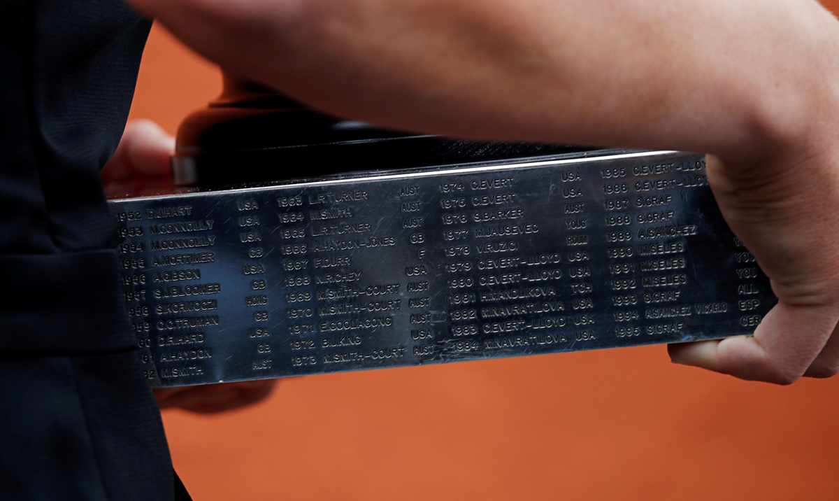 The name of the women's doubles trophy, the Coupe Simonne Mathieu, created in 1990, has also been mis-spelt 'Simone Mathieu' on the plaque and on the cup itself.
