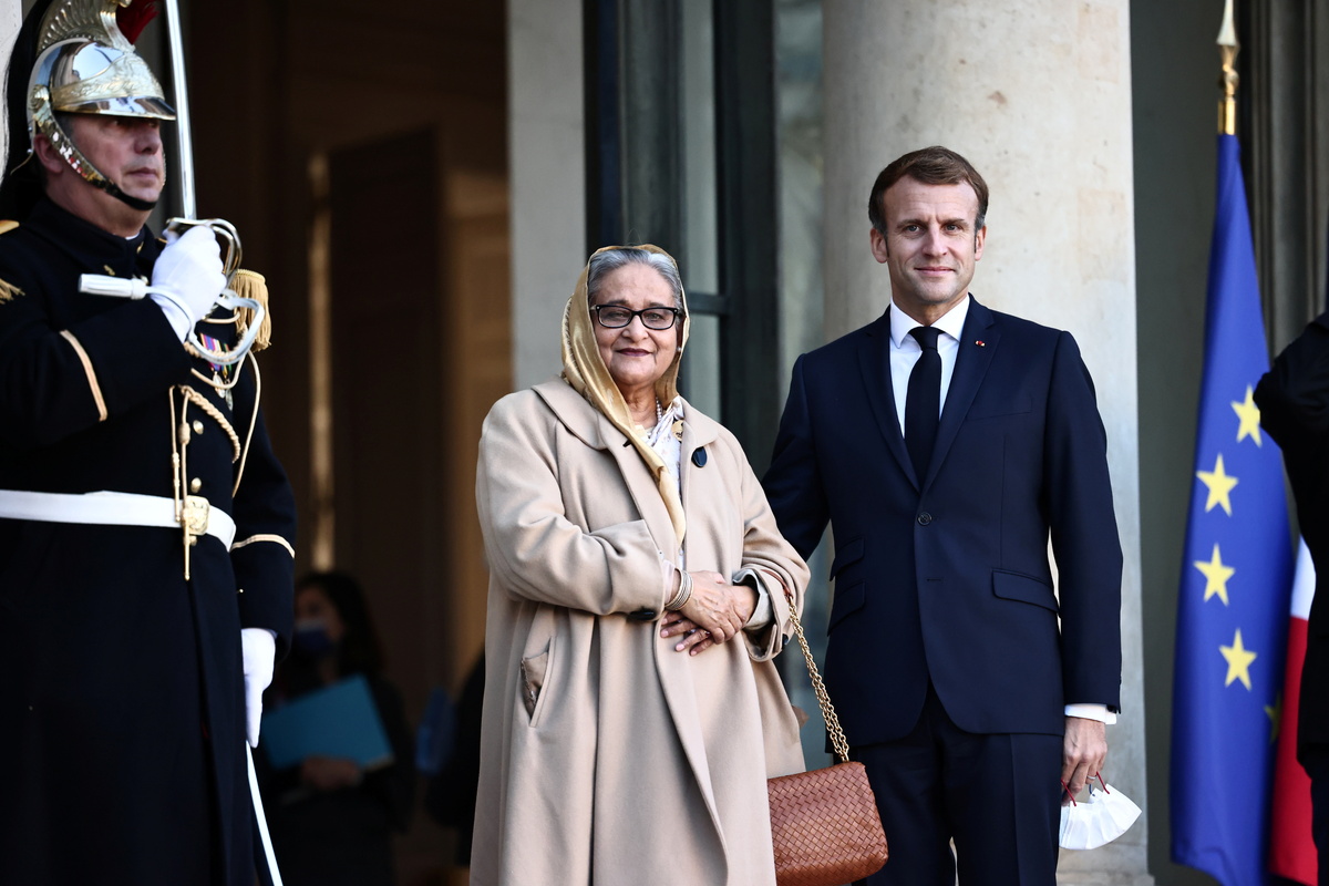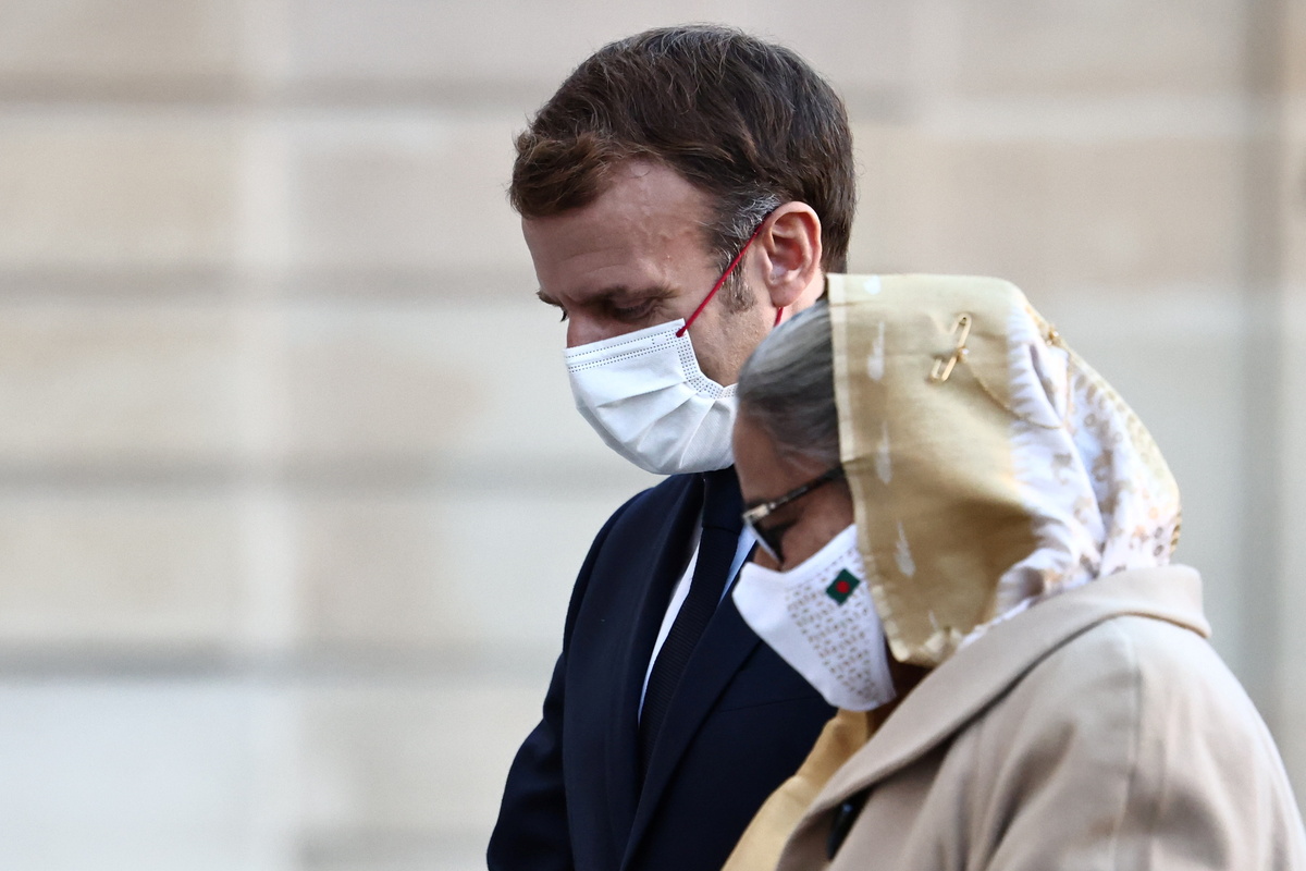 French President Emmanuel Macron discussed geopolitical and security issues in the Indo-Pacific region, where France's clout has been compromised after losing out on an Australia submarine contract, with Bangladesh's Prime Minister.