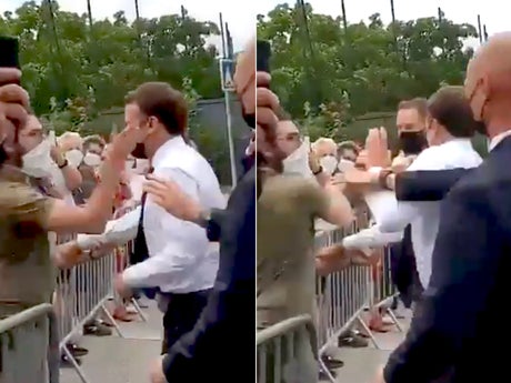 A video footage of the incident in Tain-l’Hermitage, southeastern France, shows a man in a green T-shirt and glasses shout “Down with Macronia” in French before slapping Macron’s face.