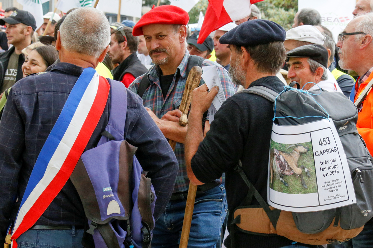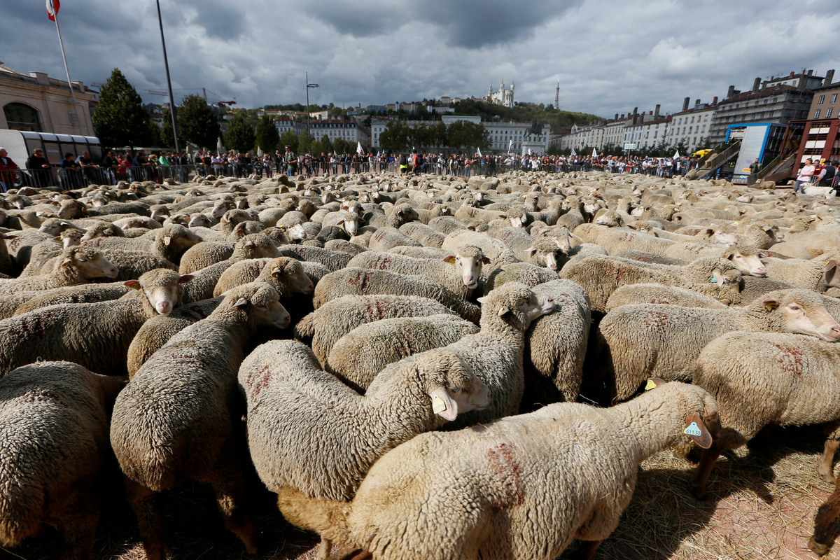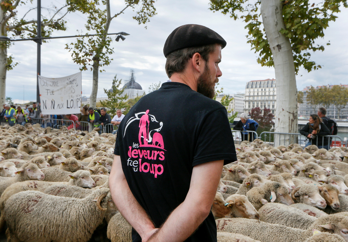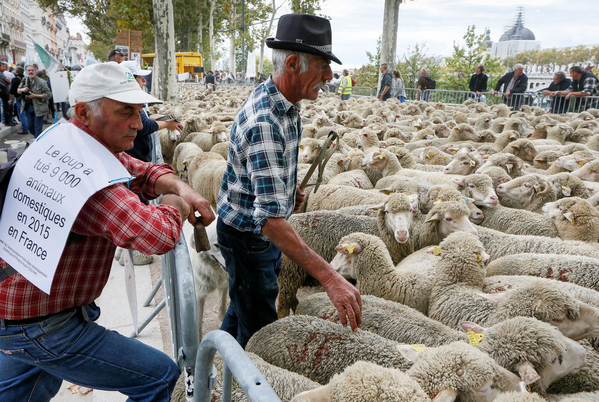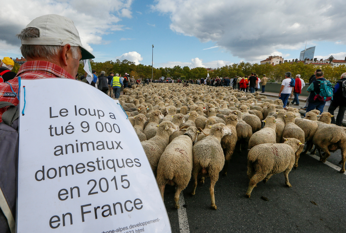 French farmers stand near hundreds of sheep during a protest against the government's "Plan loup" (wolf project) which protects wolves which the farmers blame for livestock deaths and financial losses, in Lyon, France, October 9, 2017. Placard reads, "In 2015 wolves killed 9,000 domesticated animals in France". REUTERS/Robert PrattaHundreds of sheep gather as French farmers (rear) stage a protest against the government's "Plan loup" (wolf project) as the farmers seek to protect their livestock against attacks by wolves, in Lyon, France, October 9, 2017. REUTERS/Robert Pratta French farmers stage a protest against the government's "Plan loup" (wolf project) as the farmers seek to protect their livestock against attacks by wolves, in Lyon, France, October 9, 2017. REUTERS/Robert PrattaA French farmer stands near hundreds of sheep during a protest against the government's "Plan loup" (wolf project) which protects wolves which the farmers blame for livestock deaths and financial losses, in Lyon, France, October 9, 2017. REUTERS/Robert PrattaA French farmer stands near hundreds of sheep during a protest against the government's "Plan loup" (wolf project) which protects wolves that the farmers blame for livestock deaths and financial losses, in Lyon, France, October 9, 2017. REUTERS/Robert PrattaHundreds of sheep are seen during a protest by French farmers against the government's "Plan loup" (wolf project) which protects wolves that the farmers blame for livestock deaths and financial losses, in Lyon, France, October 9, 2017. REUTERS/Robert PrattaFrench farmers walk with hundreds of sheep during a protest against the government's "Plan loup" (wolf project) that protects wolves which the farmers blame for livestock deaths and financial losses, in Lyon, France, October 9, 2017. REUTERS/Robert PrattaFrench farmers stage a protest against the government's "Plan loup" (wolf project) as the farmers seek to protect their livestock against attacks by wolves, in Lyon, France, October 9, 2017. REUTERS/Robert Pratta