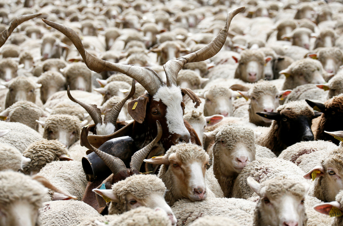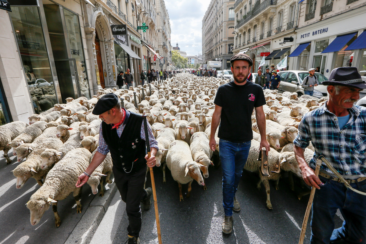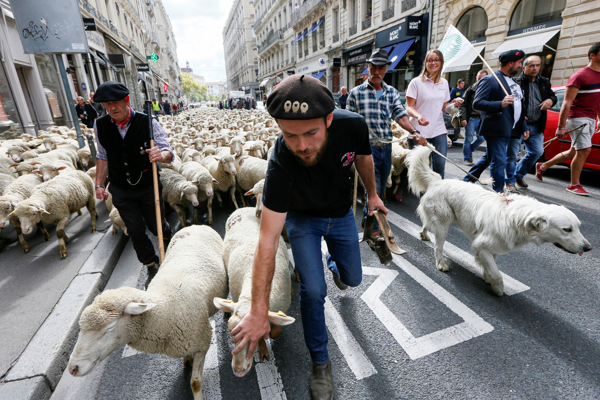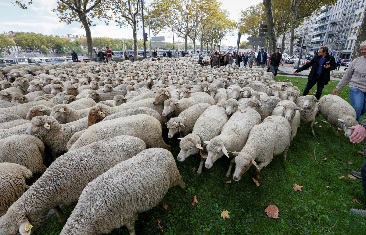 French farmers walk ahead of hundreds of sheep as they stage a protest against the government's "Plan loup" (wolf project) which protects wolves which the farmers blame for livestock deaths and financial losses, in Lyon, France, October 9, 2017. REUTERS/Robert Pratta