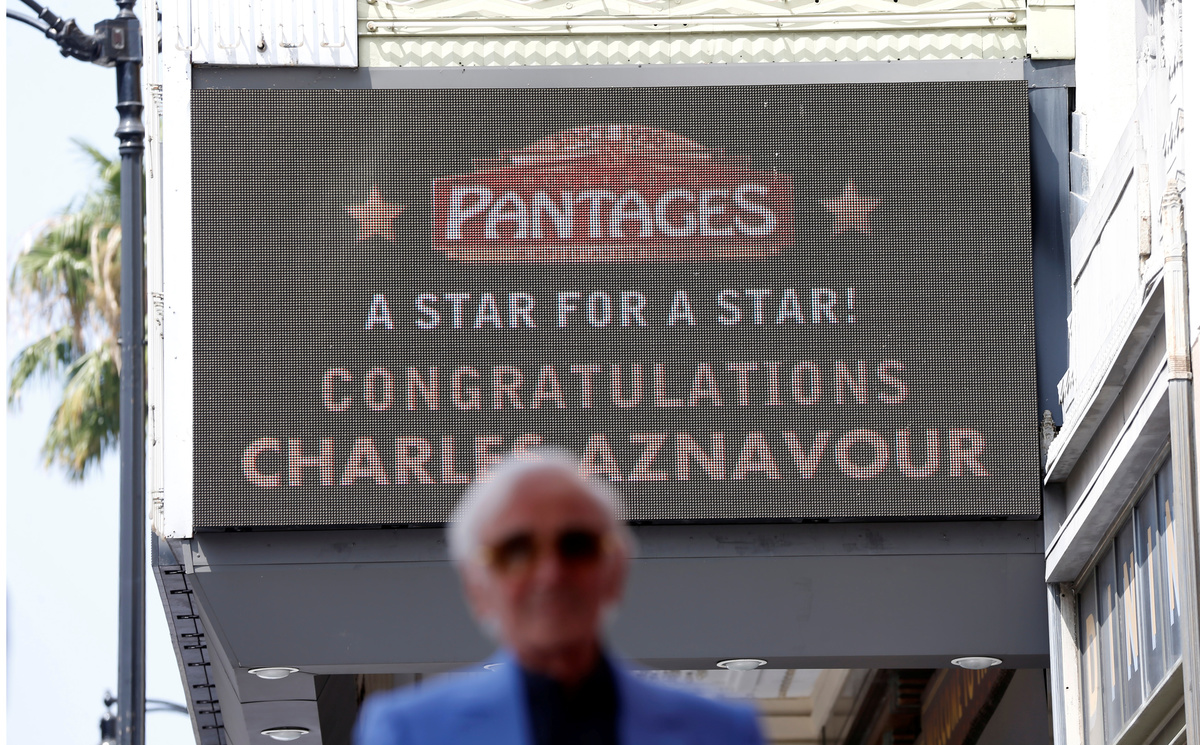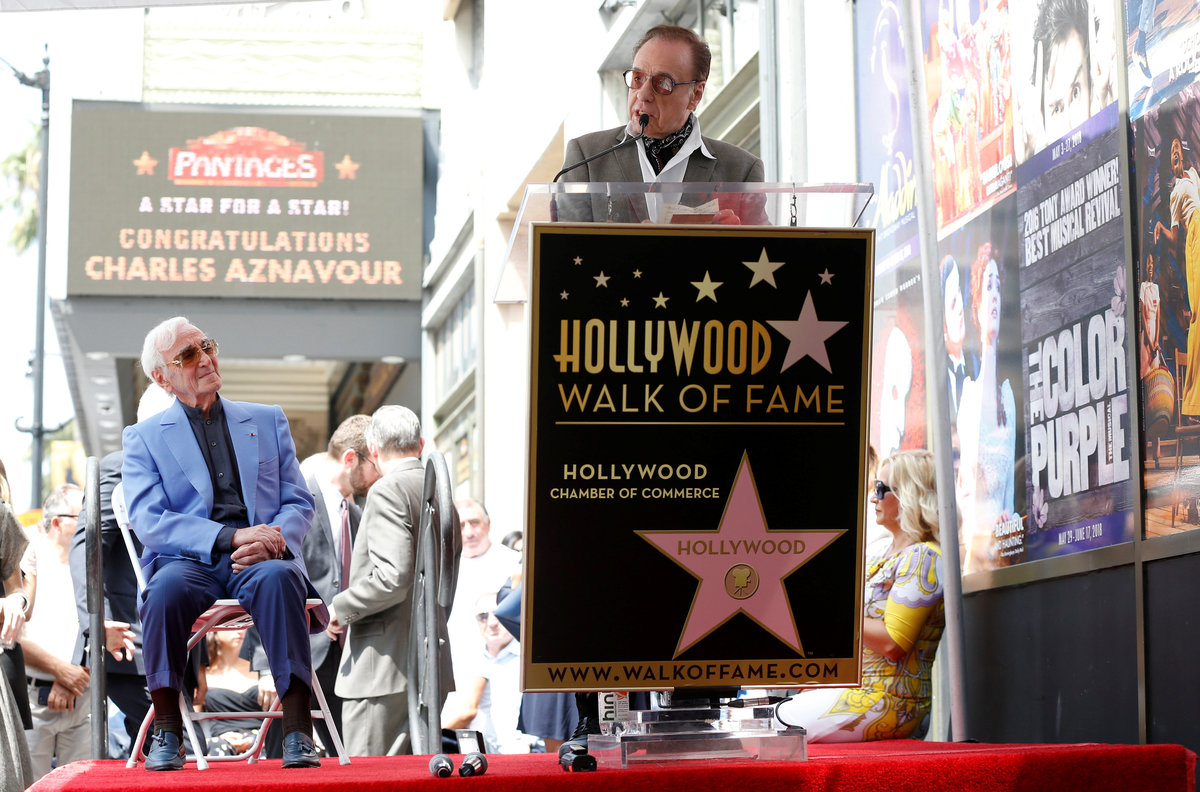 Director Peter Bogdanovich speaks before the unveiling of the star of Armenian-French singer Charles Aznavour (L) on the Hollywood Walk of Fame in Los Angeles, California, U.S., August 24, 2017. REUTERS/Mario AnzuoniThe marquee of Pantages theatre is pictured before the unveiling of the star of Armenian-French singer Charles Aznavour on the Hollywood Walk of Fame in Los Angeles, California, U.S., August 24, 2017. REUTERS/Mario AnzuoniArmenian-French singer Charles Aznavour is cheered by fans after unveiling his star on the Hollywood Walk of Fame in Los Angeles, California, U.S., August 24, 2017. REUTERS/Mario AnzuoniArmenian-French singer Charles Aznavour (R) is congratulated by director Peter Bogdanovich after unveiling his star on the Hollywood Walk of Fame in Los Angeles, California, U.S., August 24, 2017. REUTERS/Mario AnzuoniArmenian-French singer Charles Aznavour speaks to the media after unveiling his star on the Hollywood Walk of Fame in Los Angeles, California, U.S., August 24, 2017. REUTERS/Mario AnzuoniArmenian-French singer Charles Aznavour blows kisses at fans after unveiling his star on the Hollywood Walk of Fame in Los Angeles, California, U.S., August 24, 2017. REUTERS/Mario Anzuoni