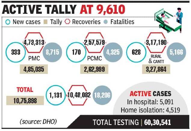 The PMC areas added 333 new patients, while the rural and cantonment areas reported 628 new patients. As many as 170 new cases were added in the Pimpri Chinchwad areas as against 191 recoveries. With this, the region’s total recoveries climbed above 10.48 lakh on Thursday, while its positive caseload increased above 10.75 lakh.