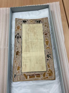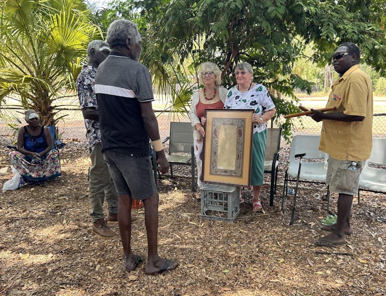 I tracked down the fourth – “our lost treasure” as Yananymul Mununggurr, daughter of Dhunggala, the sole surviving signatory to the petitions calls it – to Derby, Western Australia, and facilitated a moving handback ceremony in November between the “missing” petition’s owner and a group of Yolŋu descendants of the original signatories and artists.