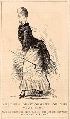 While this letter may have been tongue in cheek, it expressed the general puzzlement. The act was clearly performative, and it happened daily, from 4-5pm. Above the conventional woman’s skirt was a man’s jacket, tie, hat, starched collar and even monocle. The hair was cropped: something prescribed for women suffering fever, but not flaunted in the street. One observer noted slangy speech, loud laughter, a bold gaze – all unwomanly behaviour.