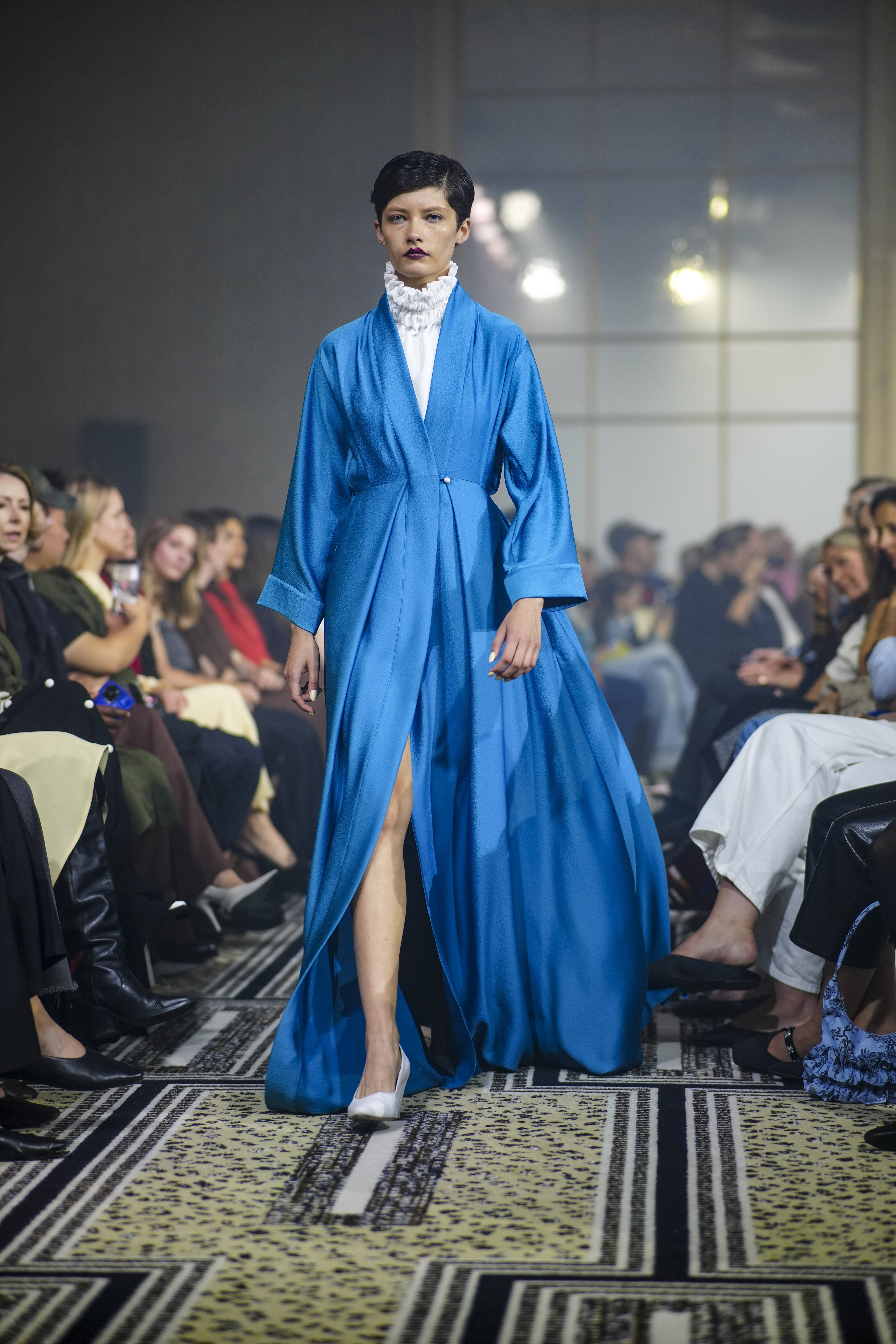 The show included a grey dress that ballooned at the hip then tapered toward the hem, its construction both generous and disciplined. This piece set the tone for the show – bold shapes with internal structure enough to make them more wearable than dramatic.