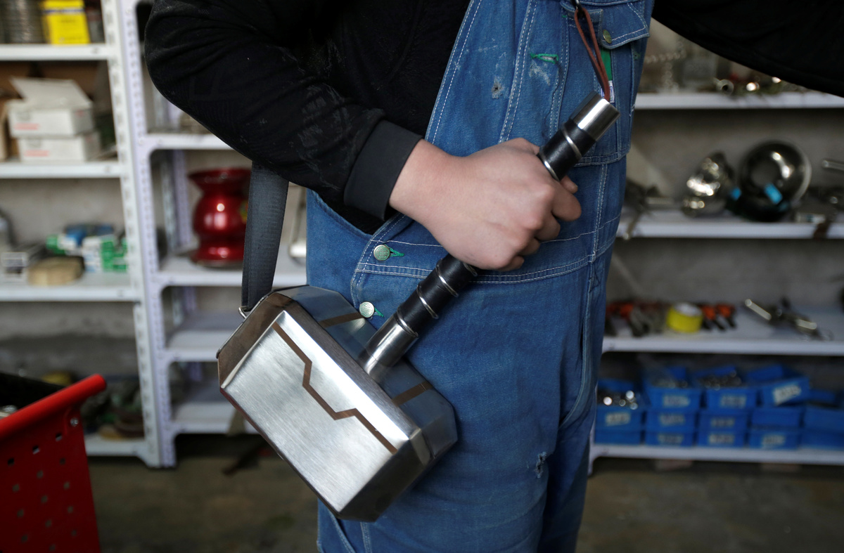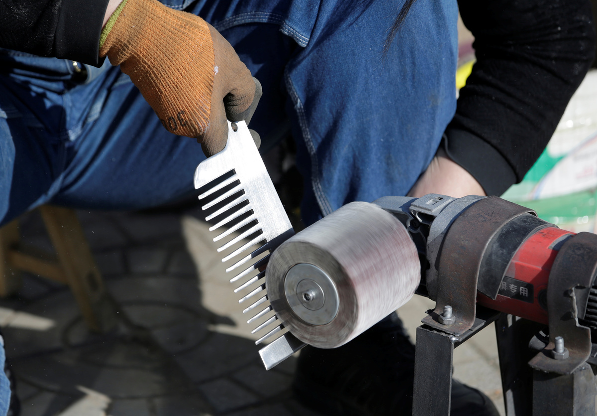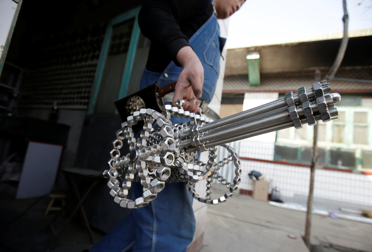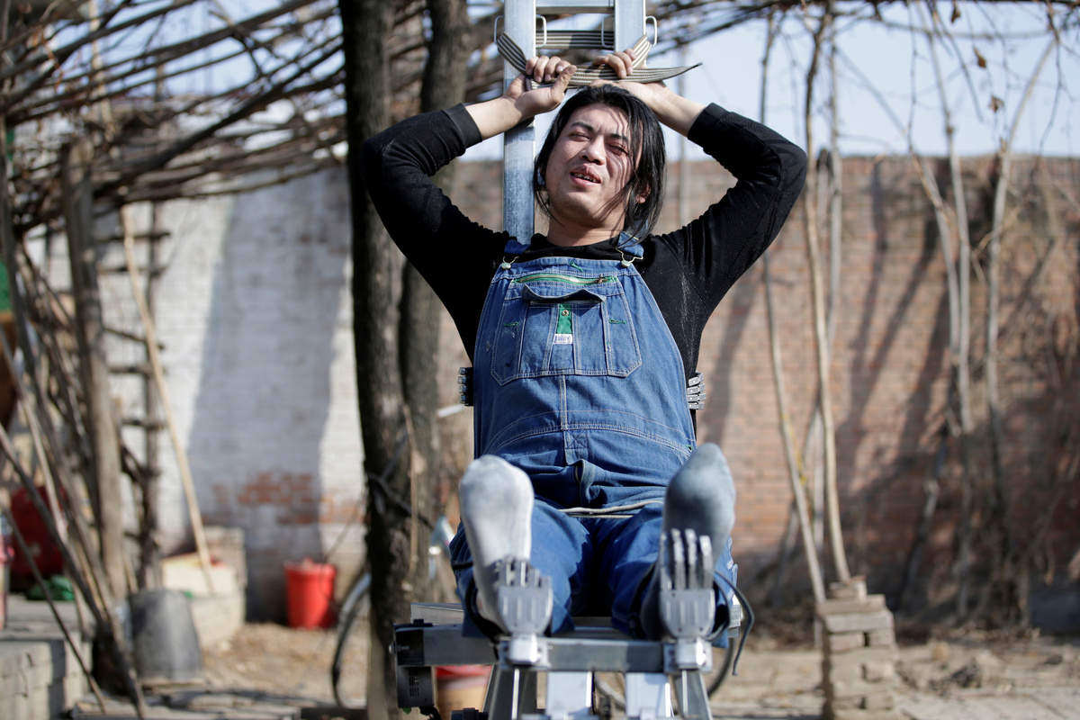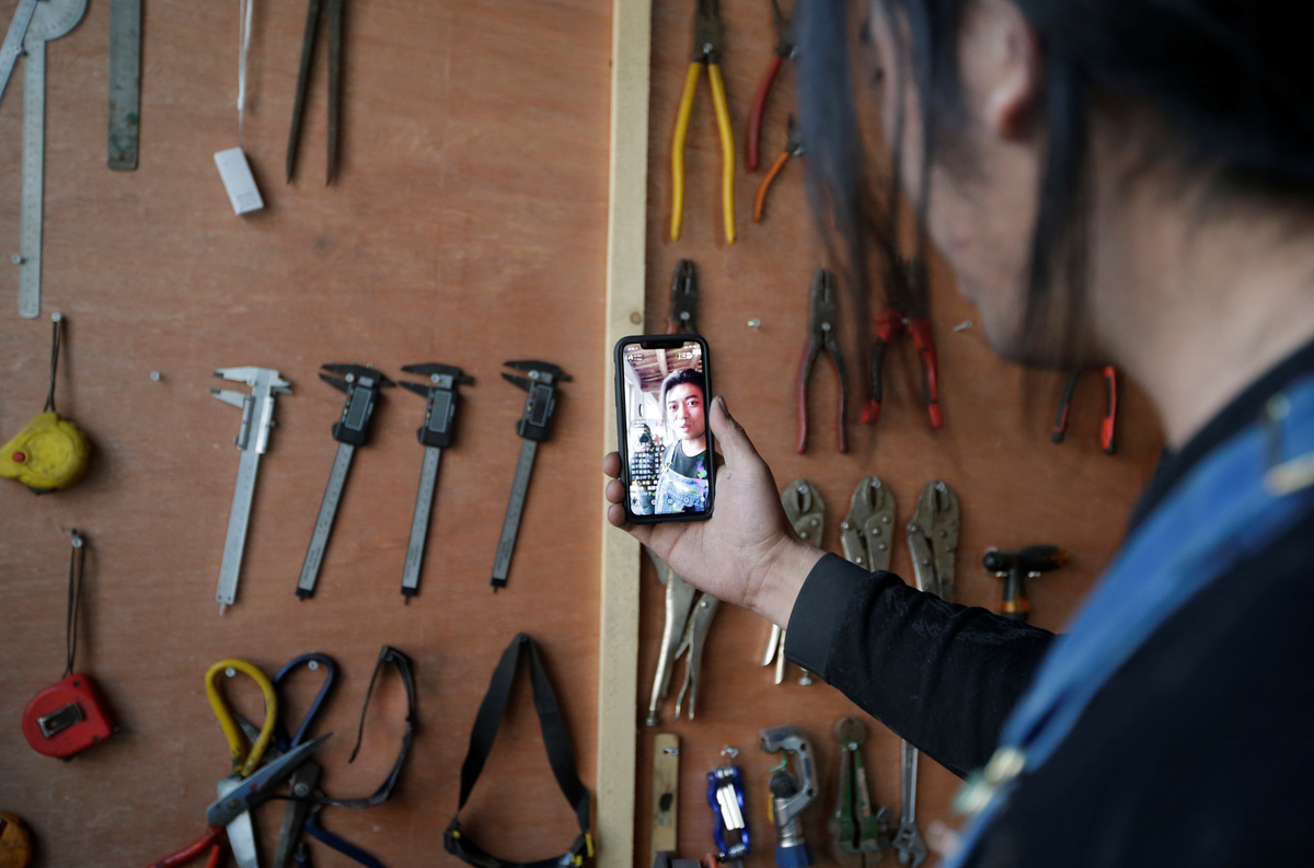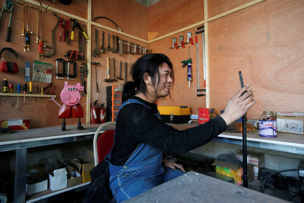 Geng Shuai, dubbed "Useless Edison" by his fans, burnishes a stainless steel comb for sale at his internet shop in Yangcun village of Baoding, Hebei province, China January 22, 2019. Picture taken January 22, 2019. REUTERS/Jason LeeGeng Shuai, dubbed "Useless Edison" by his fans, fastens the belts as he poses on his invention "happy chair", a workout bench with robotic arms to tickle the underarms and the feet, outside his workshop in Yangcun village of Baoding, Hebei province, China January 22, 2019. Picture taken January 22, 2019. REUTERS/Jason LeeGeng Shuai, dubbed "Useless Edison" by his fans, poses with his invention, a mobile phone case in the shape of a knife, outside his workshop in Yangcun village of Baoding, Hebei province, China January 22, 2019. Picture taken January 22, 2019. REUTERS/Jason LeeA neighbour looks at Geng Shuai, dubbed "Useless Edison" by his fans, in Yangcun village of Baoding, Hebei province, China January 22, 2019. Picture taken January 22, 2019. REUTERS/Jason LeeGeng Shuai, dubbed "Useless Edison" by his fans, carries a stainless steel handbag in the shape of a hammer as he gives a live broadcast at his workshop in Yangcun village of Baoding, Hebei province, China January 22, 2019. Picture taken January 22, 2019. REUTERS/Jason LeeGeng Shuai, dubbed "Useless Edison" by his fans, prepares a tool for burnishing work at a yard outside his workshop in Yangcun village of Baoding, Hebei province, China January 22, 2019. Picture taken January 22, 2019. REUTERS/Jason LeeA sculpture depicting animated series character Peppa Pig, made of an air blower, stands next to Geng Shuai's tools at his workshop in Yangcun village of Baoding, Hebei province, China January 22, 2019. Picture taken January 22, 2019. REUTERS/Jason LeeAn uncompleted sculpture depicting animated series character Peppa Pig, made of an air blower, is seen at Geng Shuai's workshop in Yangcun village of Baoding, Hebei province, China January 22, 2019. Picture taken January 22, 2019. REUTERS/Jason LeeGeng Shuai, dubbed "Useless Edison" by his fans, poses on his invention "happy chair", a workout bench with robotic arms to tickle the underarms and the feet, outside his workshop in Yangcun village of Baoding, Hebei province, China January 22, 2019. Picture taken January 22, 2019. REUTERS/Jason LeeGeng Shuai, dubbed "Useless Edison" by his fans, carries an invention in the shape of a cannon to perform outside his workshop in Yangcun village of Baoding, Hebei province, China January 22, 2019. Picture taken January 22, 2019. REUTERS/Jason LeeGeng Shuai, dubbed "Useless Edison" by his fans, works on a sculpture depicting animated series character Peppa Pig, made of an air blower, at his workshop in Yangcun village of Baoding, Hebei province, China January 22, 2019. Picture taken January 22, 2019. REUTERS/Jason LeeGeng Shuai, dubbed "Useless Edison" by his fans, prepares to give a live broadcast at his workshop in Yangcun village of Baoding, Hebei province, China January 22, 2019. Picture taken January 22, 2019. REUTERS/Jason LeeGeng Shuai, dubbed "Useless Edison" by his fans, works on a sculpture depicting animated series character Peppa Pig, made of an air blower, at his workshop in Yangcun village of Baoding, Hebei province, China January 22, 2019. Picture taken January 22, 2019. REUTERS/Jason LeeGeng Shuai, dubbed "Useless Edison" by his fans, shows the tools during a live broadcast at his workshop in Yangcun village of Baoding, Hebei province, China January 22, 2019. Picture taken January 22, 2019. REUTERS/Jason Lee