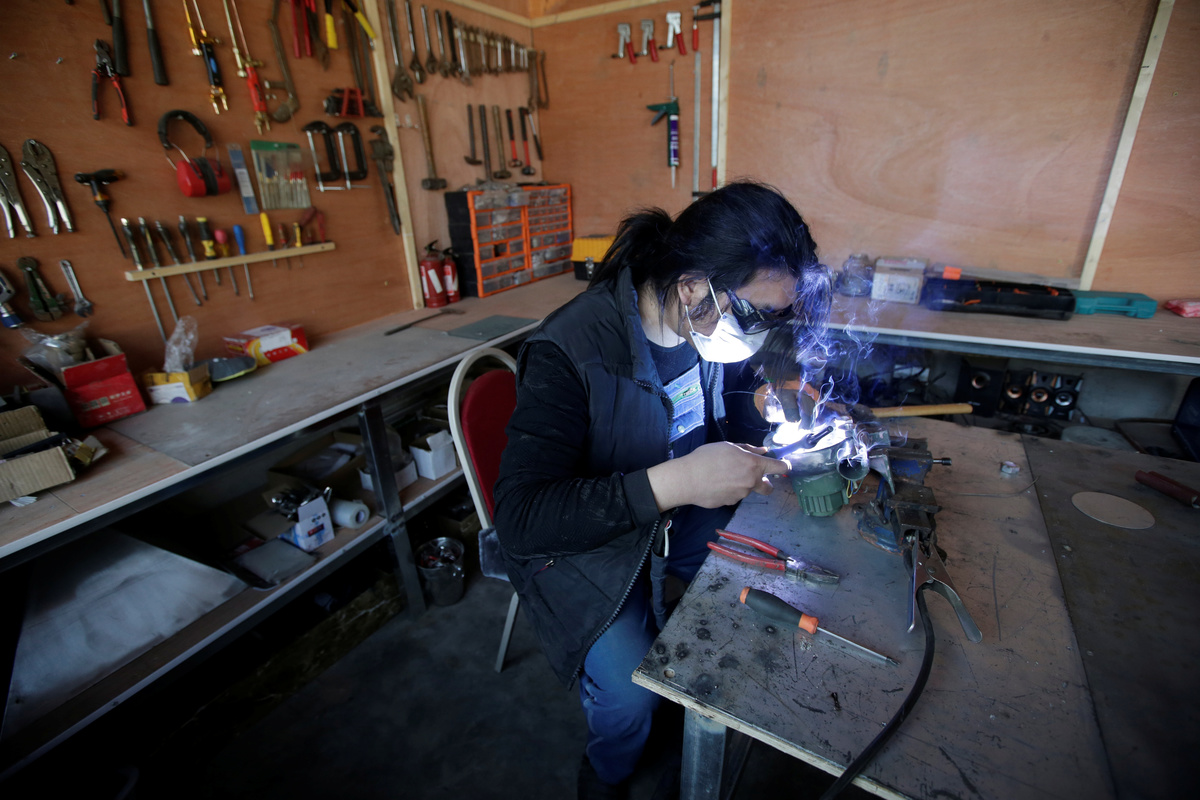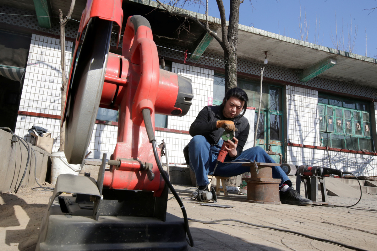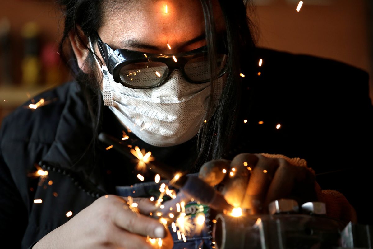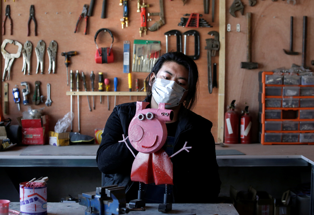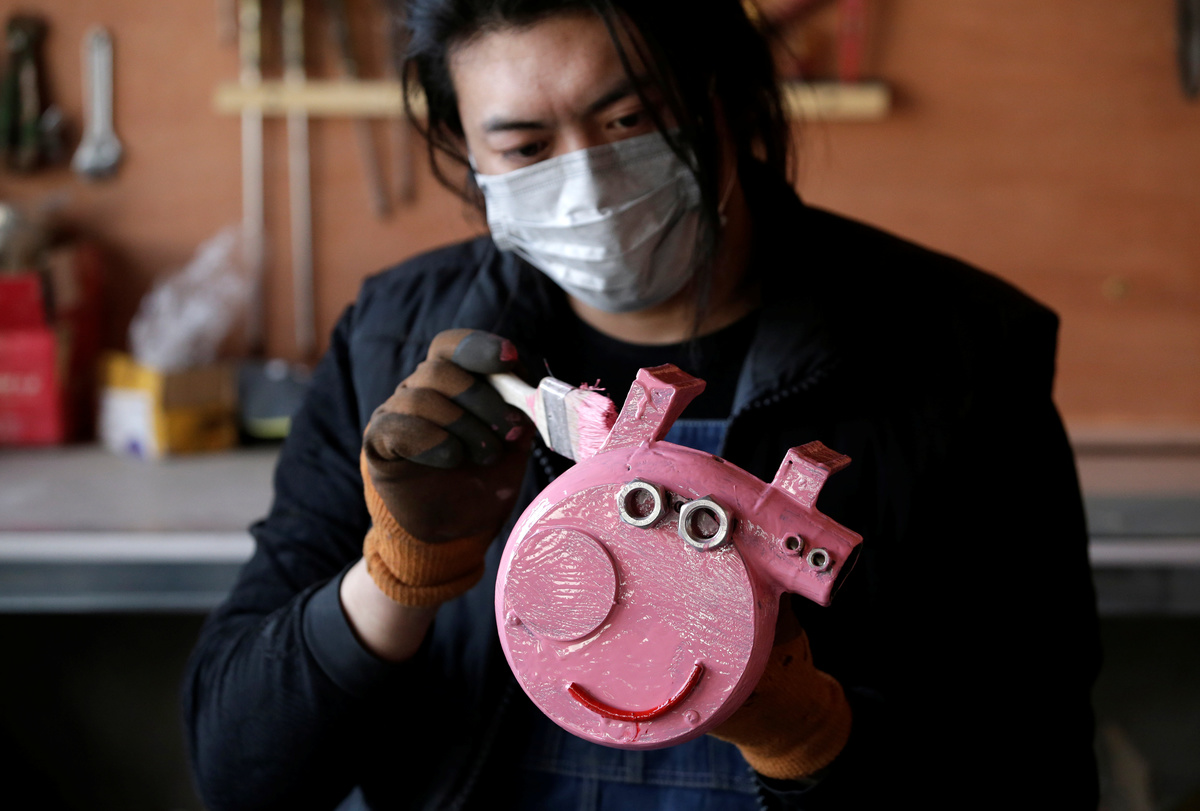 Geng Shuai, dubbed "Useless Edison" by his fans, does welding work on a sculpture depicting animated series character Peppa Pig, made of an air blower, at his workshop in Yangcun village of Baoding, Hebei province, China January 22, 2019. Picture taken January 22, 2019. REUTERS/Jason Lee