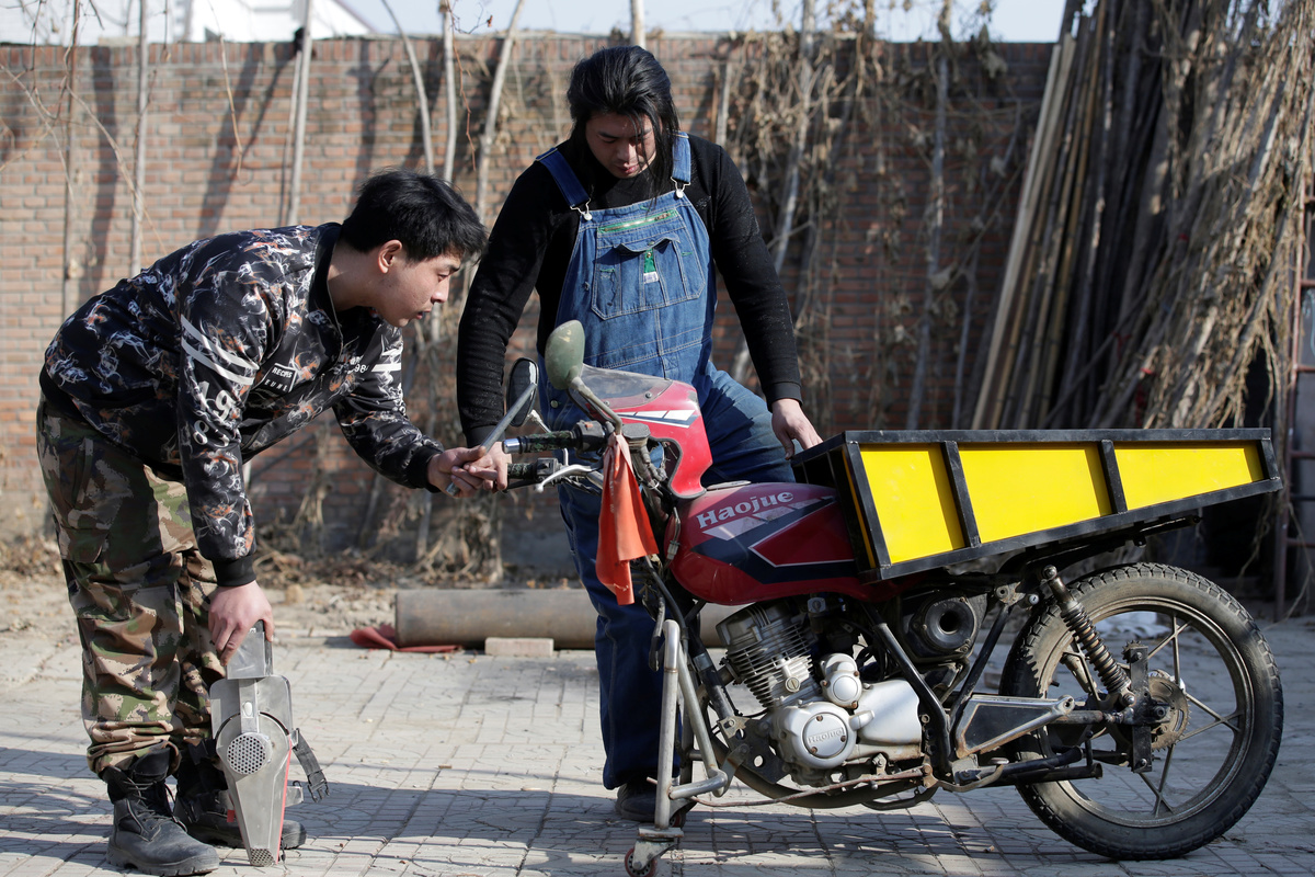 Geng Shuai, dubbed "Useless Edison" by his fans, gets a motorcycle started, that was refitted to transport vegetables for sale, under the help of his brother Geng Da (L), at a yard outside his workshop in Yangcun village of Baoding, Hebei province, China January 22, 2019. Picture taken January 22, 2019. REUTERS/Jason Lee