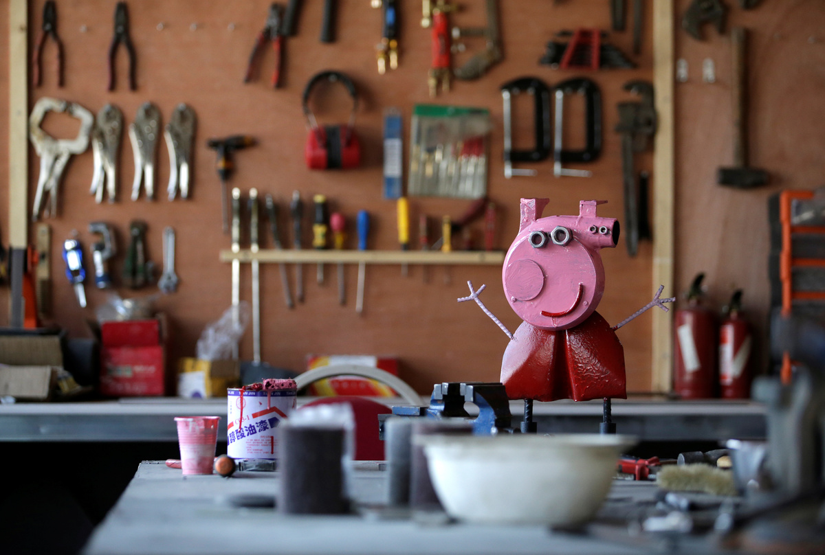 Geng Shuai, dubbed "Useless Edison" by his fans, works on a sculpture depicting animated series character Peppa Pig, made of an air blower, at his workshop in Yangcun village of Baoding, Hebei province, China January 22, 2019. Picture taken January 22, 2019. REUTERS/Jason Lee