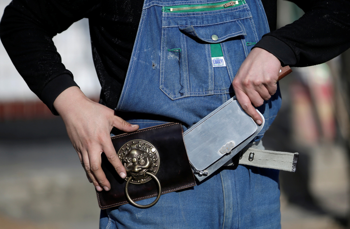 Geng Shuai, dubbed "Useless Edison" by his fans, poses with his invention, a mobile phone case in the shape of a knife, outside his workshop in Yangcun village of Baoding, Hebei province, China January 22, 2019. Picture taken January 22, 2019. REUTERS/Jason Lee