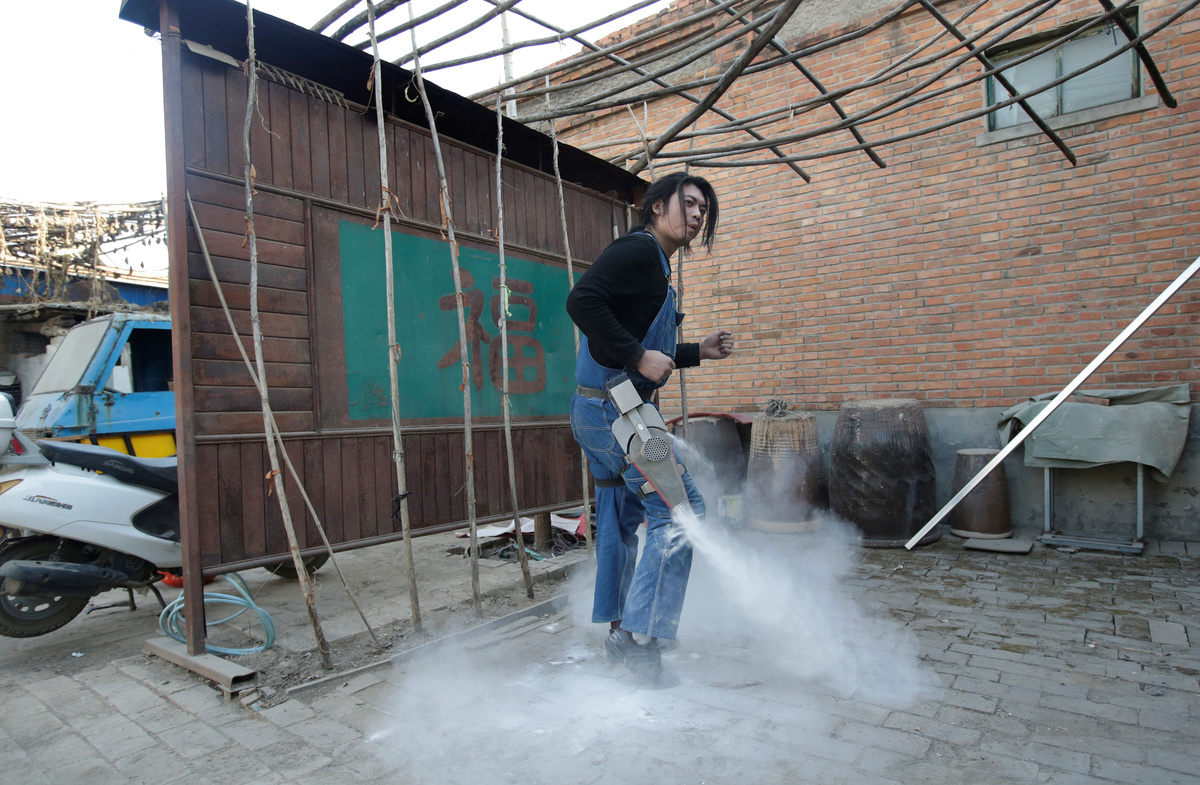 Geng Shuai, dubbed "Useless Edison" by his fans, poses to dance with a device to create theatrical fog effect with flour around him outside his workshop in Yangcun village of Baoding, Hebei province, China January 22, 2019. Picture taken January 22, 2019. REUTERS/Jason Lee