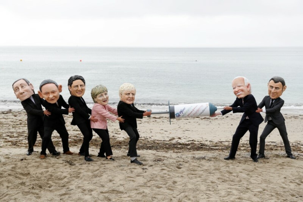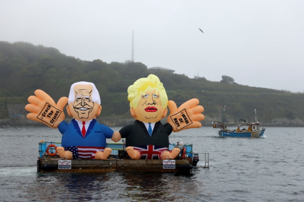 Blimps of Joe Biden and Boris Johnson floated off the Cornish coast on Friday as hundreds of protesters targeted the G7 summit in southwest England to demand action on the climate, poverty and COVID-19.