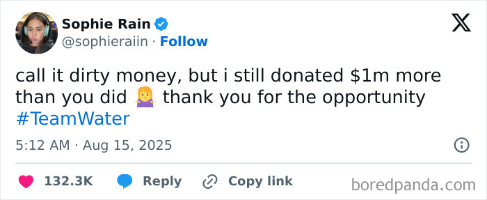 She later posted about the pledge on X, calling the cause “awesome” (according to Variety) and presenting it as a response to online haters.