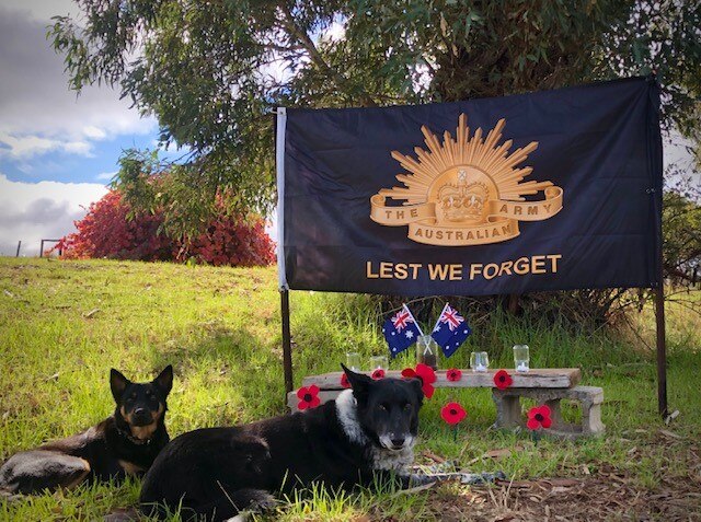 Kate, Scott and Emily gathered with their dogs Trooper and Scout for an early morning dawn service at their own roadside memorial in McLaren Vale in South Australia.