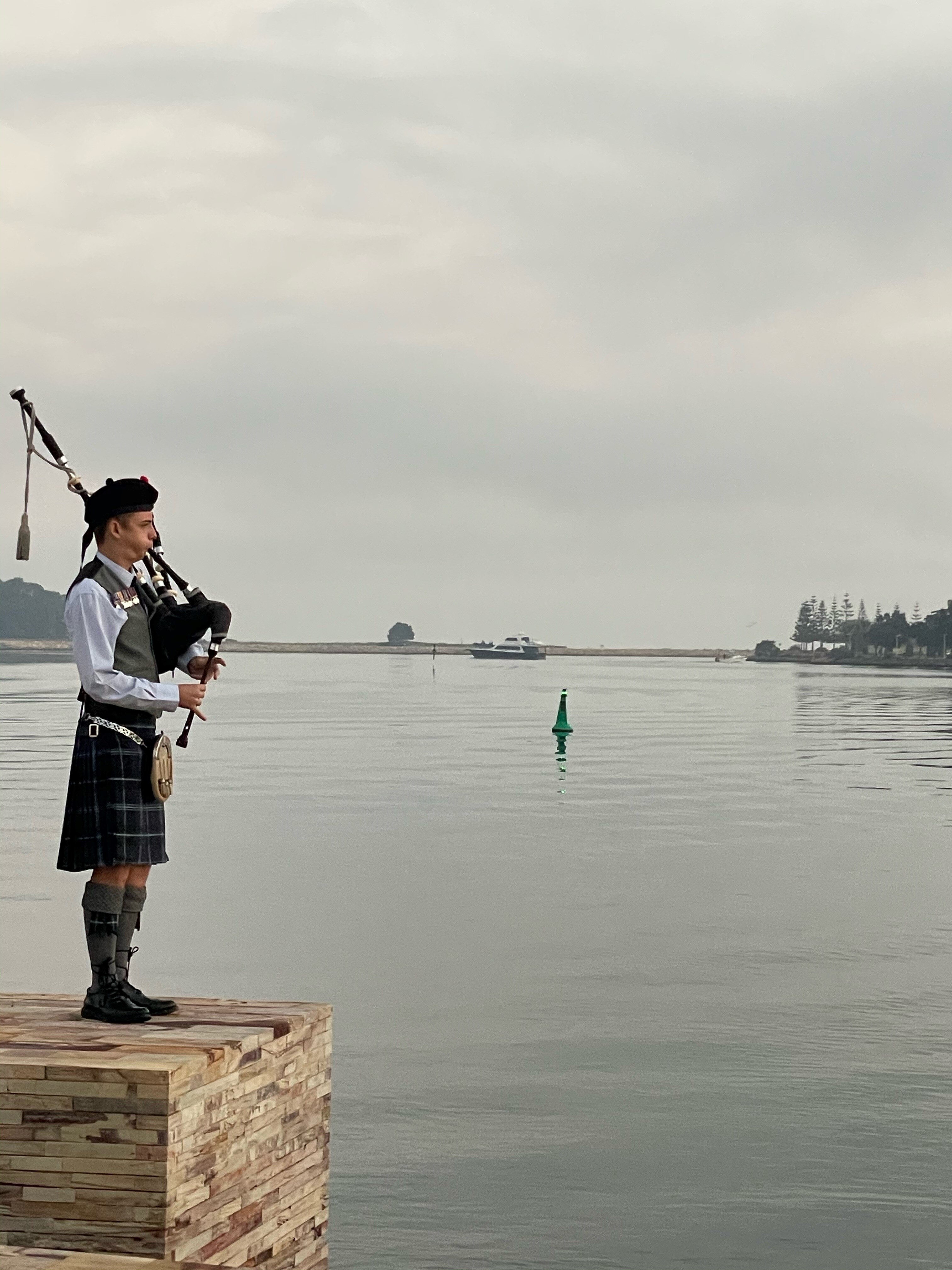 Pipe Sergeant Logan Waddell played a lament at the War Memorial in Mandurah in Western Australia after playing in his family's driveway in Parklands.
