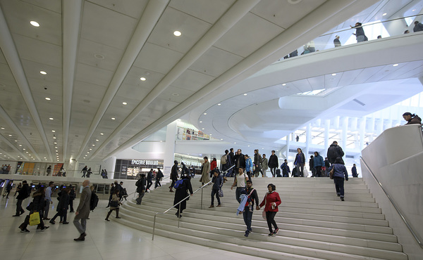 That fits the suburban-style playbook of Westfield, the big mall operator that's paying the Port Authority about $1.4 billion for the rights to the hub's retail facilities. To date, there are more than 75 stores, from Apple to Zaro's bakery, in what is called Westfield World Trade Center, as though this were any mall. Many of the stores face inward, toward the Oculus' interior. The interior itself, a classic Calatrava composition of symmetrical white structural members, is at once breathtaking and a letdown.