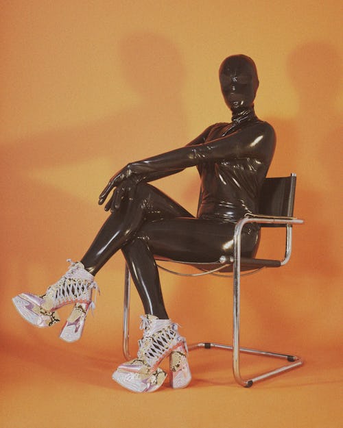 Creating a genderless offering comes naturally to Goodey, who actually began her design career making heels for men and women while apprenticing for a bespoke fetish shoe company. (In the fetish subculture, men have worn stilettos and spiky boots for decades, but solely for use in the bedroom). While starting her own label, Goodey also worked for luxury shoe brands Nicholas Kirkwood and Jimmy Choo, where she discovered the limitations of mainstream shoemaking. “Most machinery in factories that are making high-heeled shoes only accommodate up to a certain size,” she said, explaining that standard heel press machines — which attach the heel to the sole — only fit up to a US size 11 or 12.