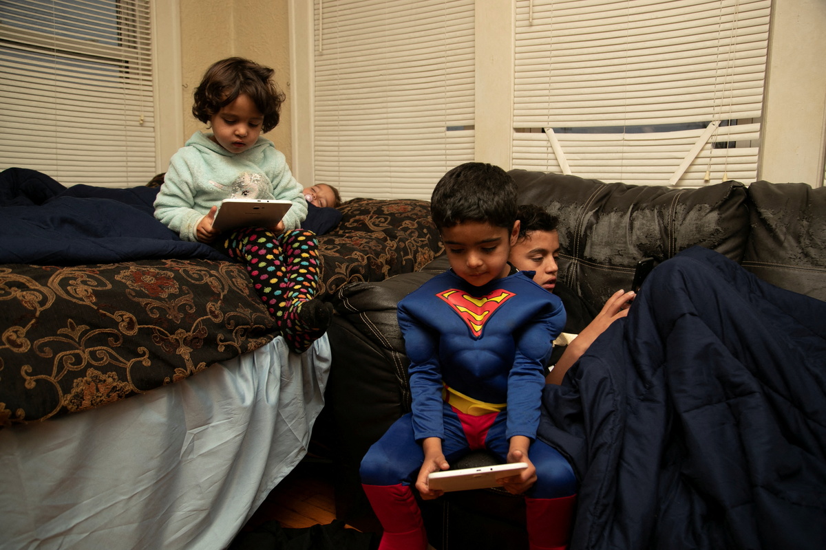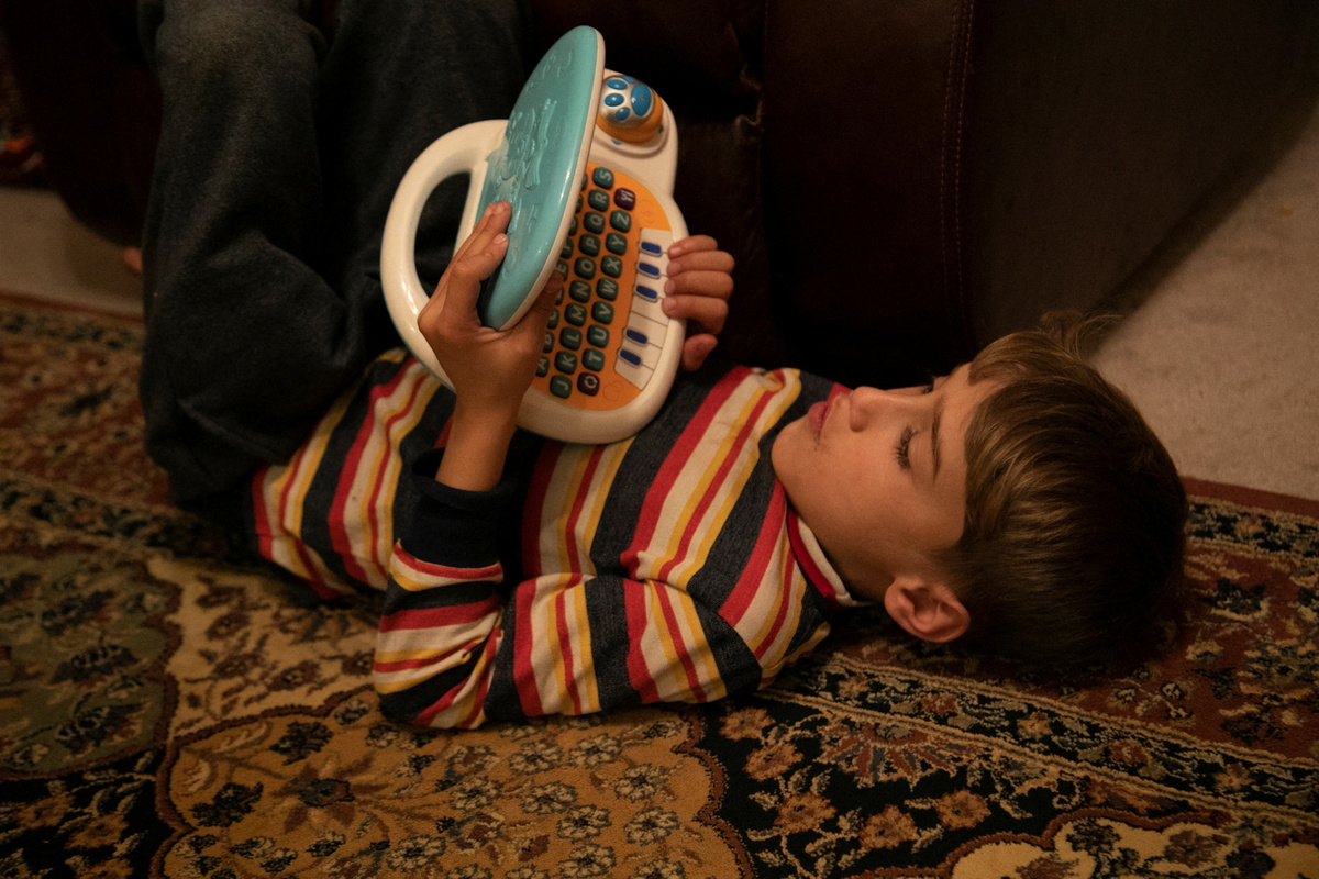Sharifullah Habibi, 8, plays with a toy computer that teaches English, in Bowling Green, Kentucky, U.S., November 27 2021. Bowling Green has welcomed waves of refugees over four decades, beginning with the Cambodians in the 1980s and then Bosnians in the 1990s, plus Iraqis, Burmese, Rwandese and Congolese and others, who have helped make the city of 72,000 a diverse and economically thriving place. REUTERS/Amira Karaoud