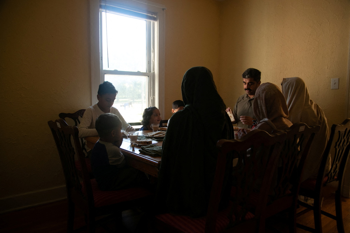 Wazir Khan Zadran, 41, and his wife Noorina Zadran, 36, eat breakfast with their children at home in Bowling Green, Kentucky, U.S., November 6 2021. Wazir, an Afghan refugee, was a tribal leader who fought against the Haqqani network, a powerful faction within the Taliban. He said the Americans saved him and his family by picking them up in a Chinook helicopter in August and taking them to the Kabul airport. After a spell at a New Mexico military base, they were sent to Bowling Green. "We are so happy in Bowling Green," he said. "Also, the local community is helping us and introducing the culture to us," REUTERS/Amira Karaoud